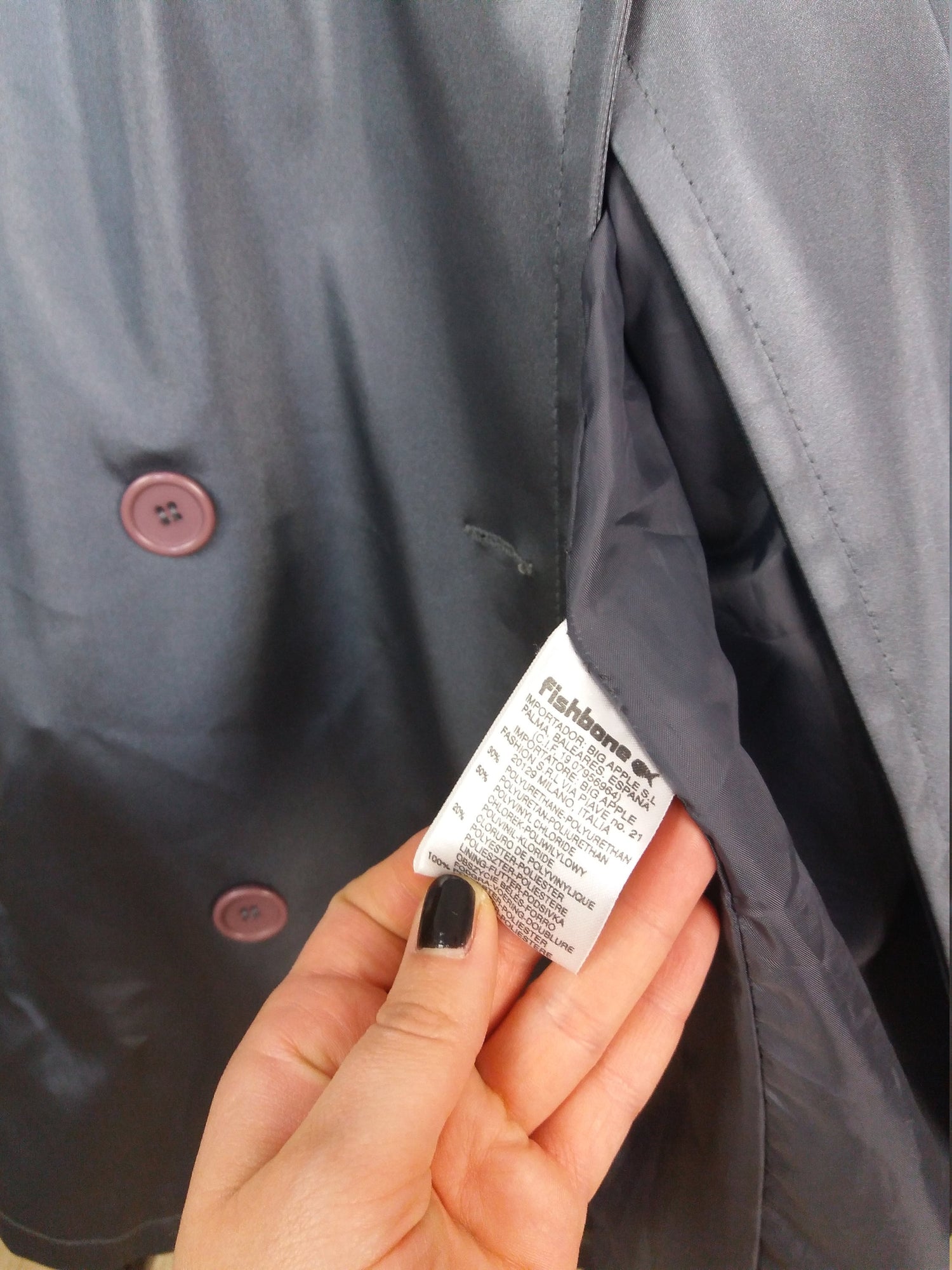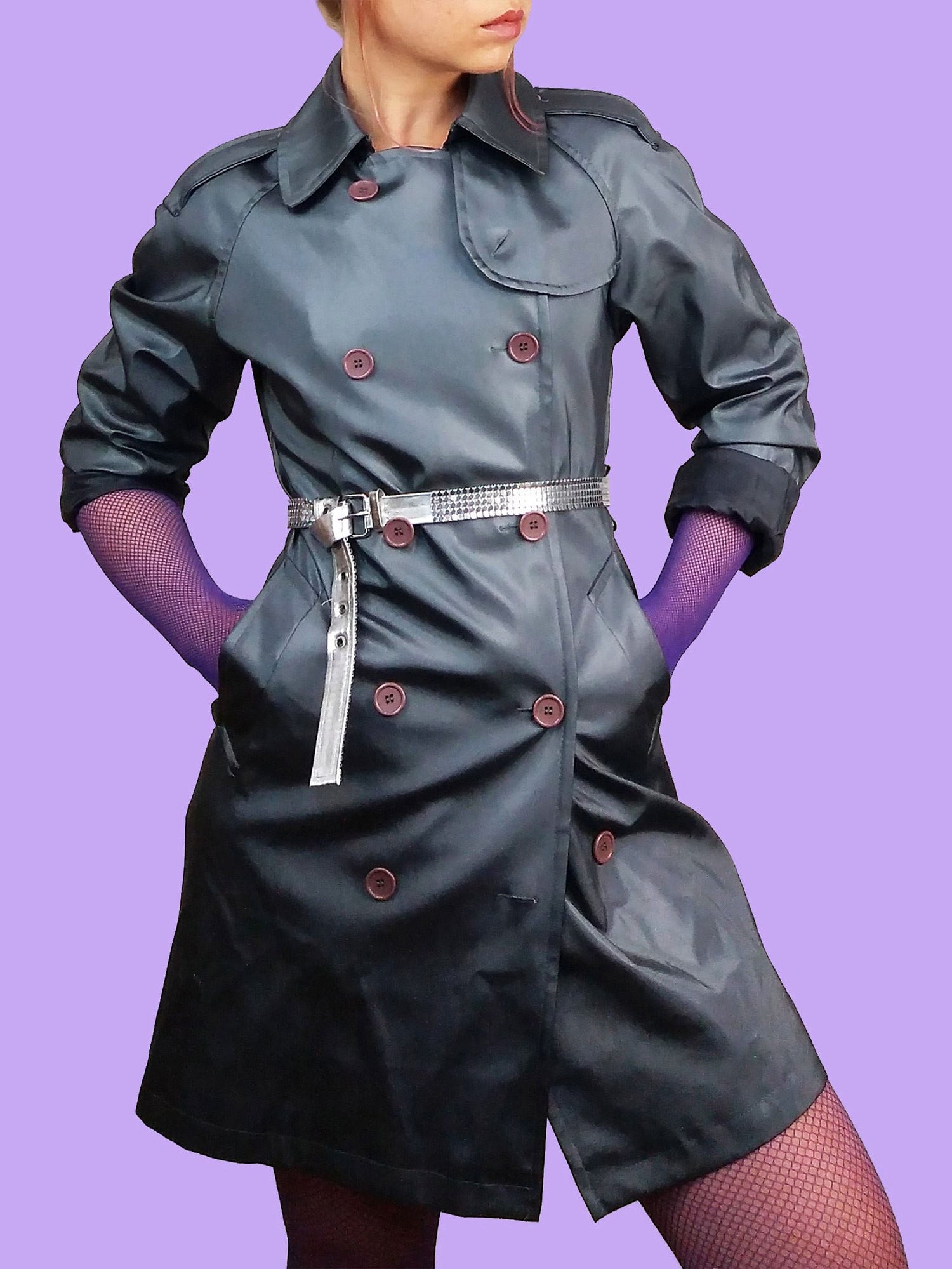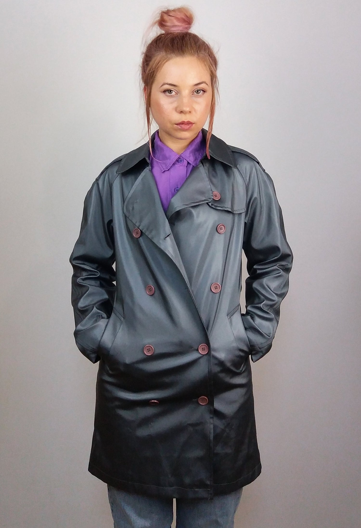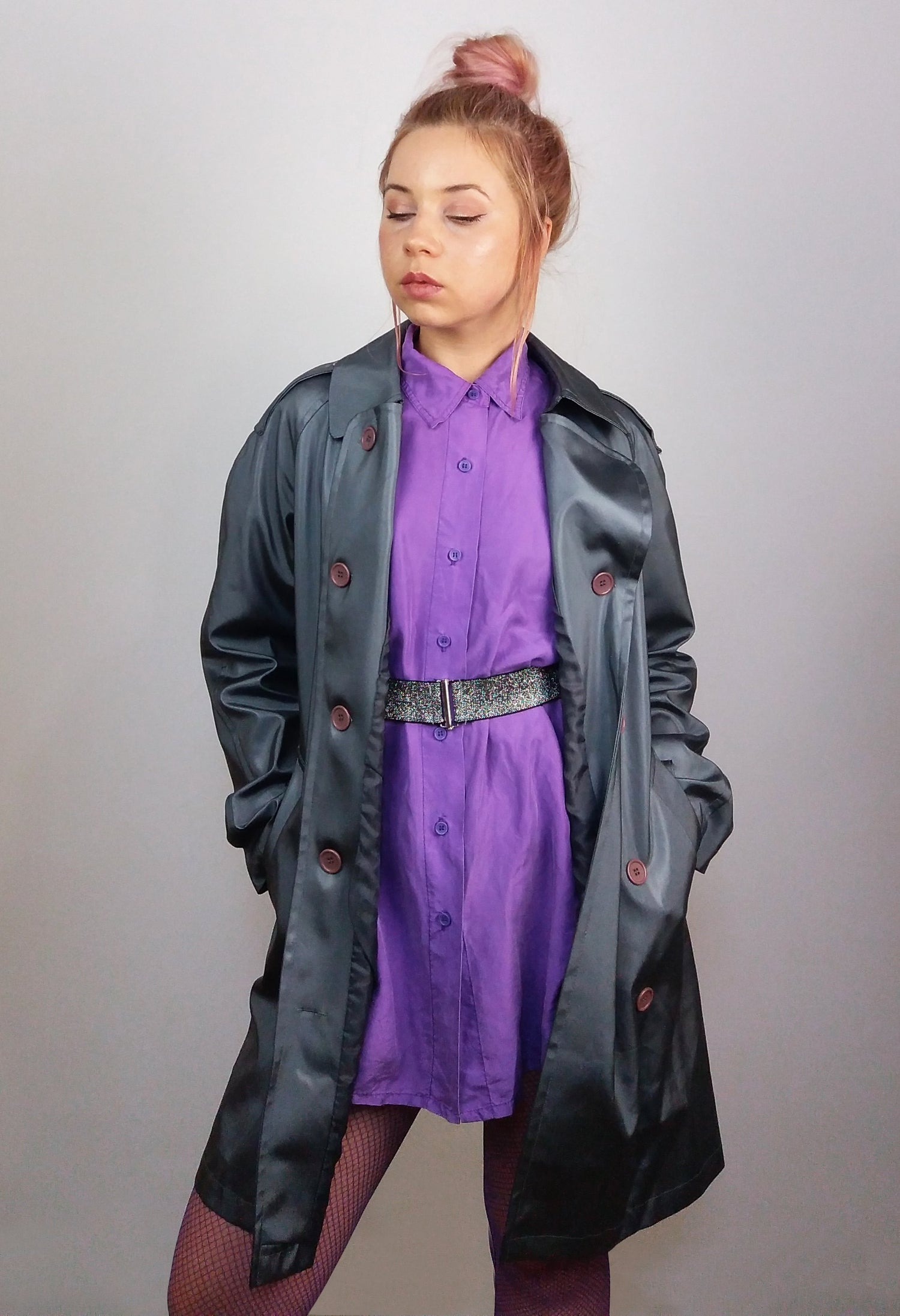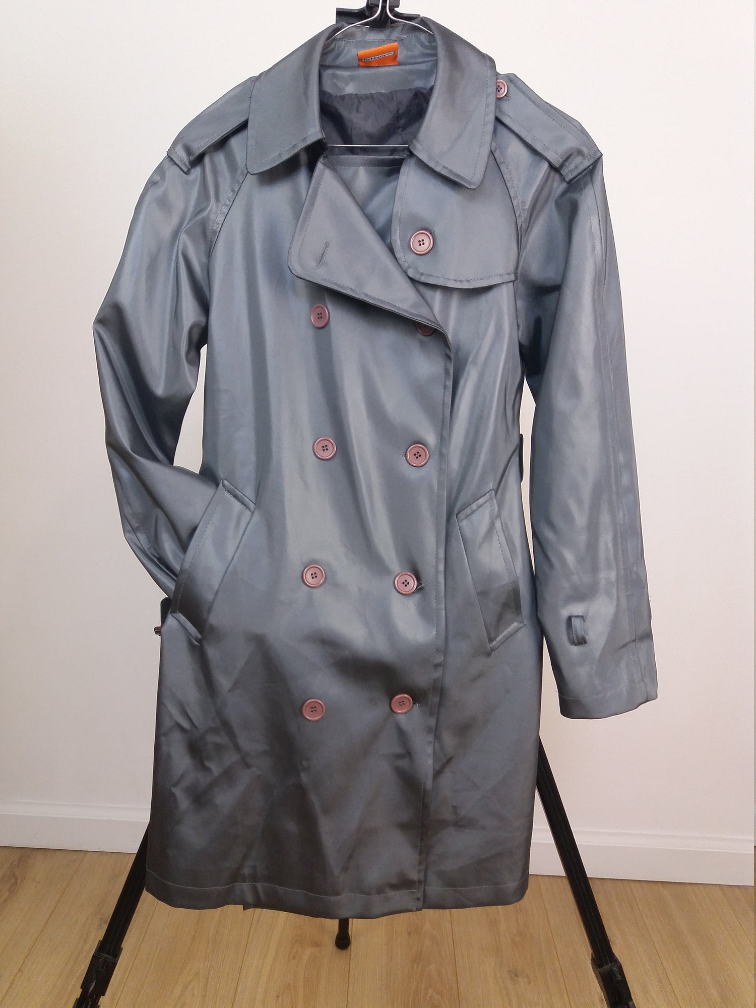 Gorgeous trench-coat, gunpowder-blue shiny texture. Versatile item. Has belt loops, but no belt. Belt pictured is not included.