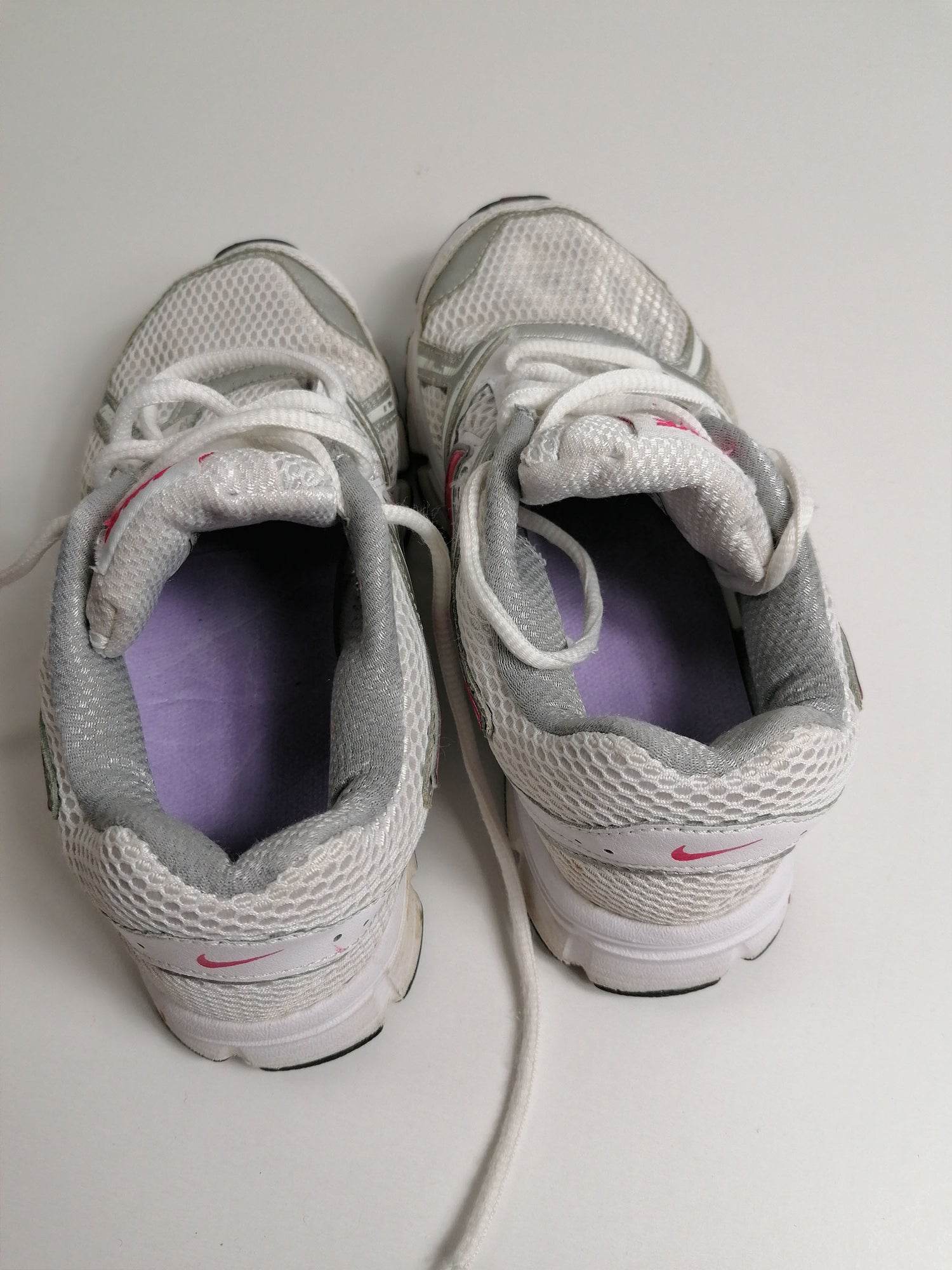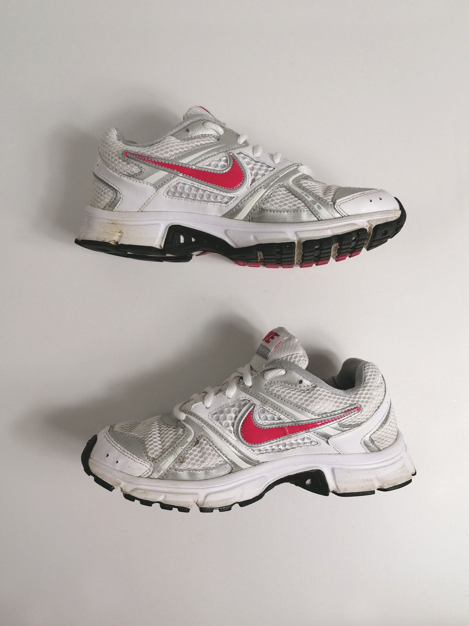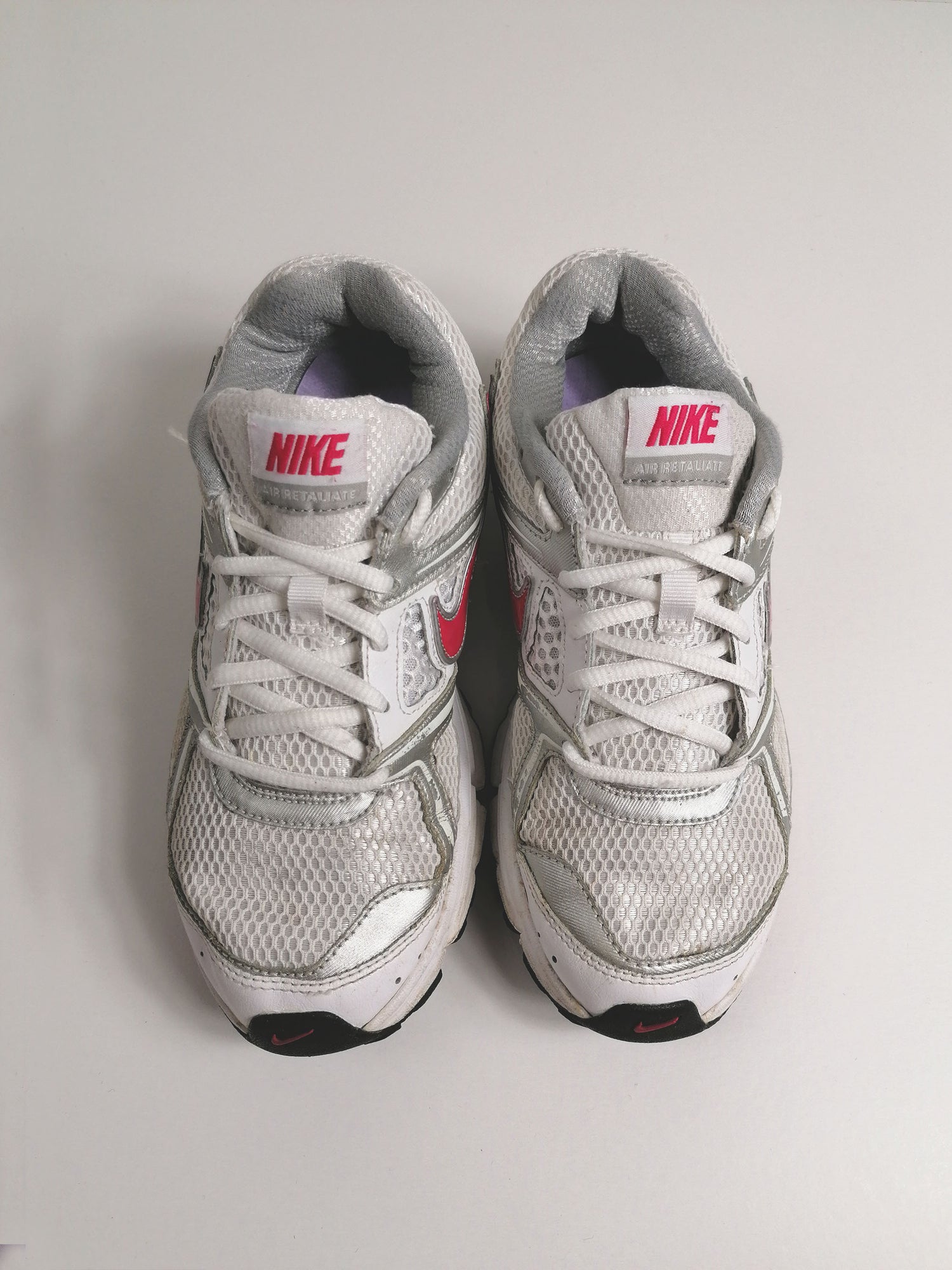 Vintage 2010 Nike Air Retaliate running/tennis sneakers, silver mesh with pink swoosh.