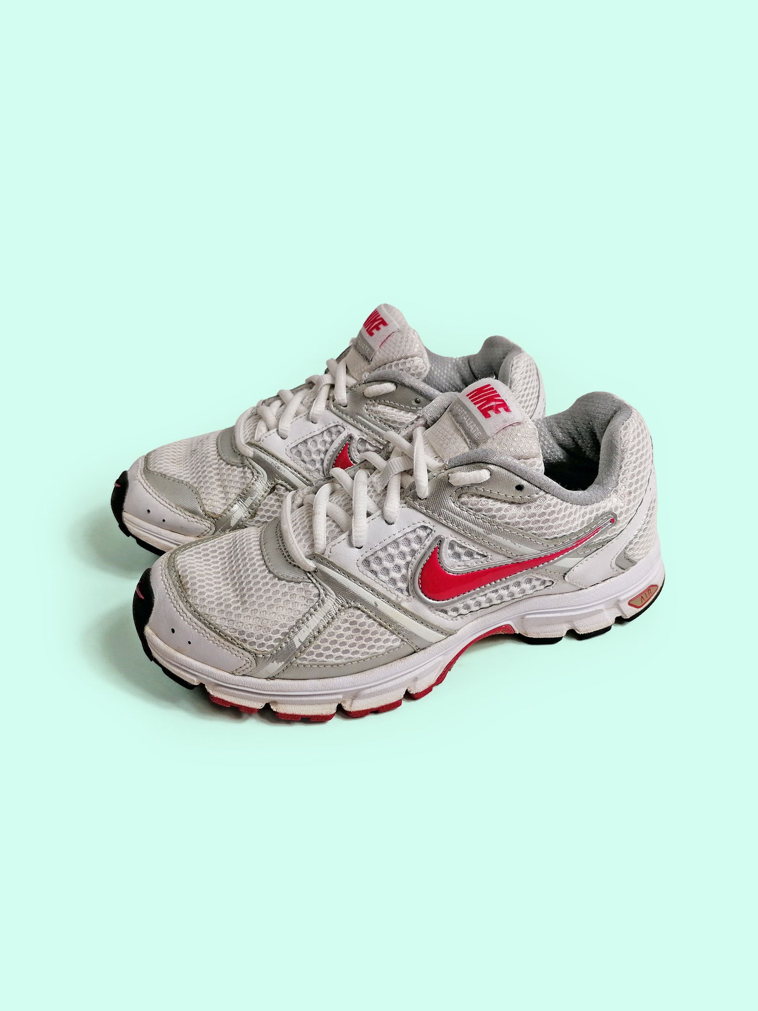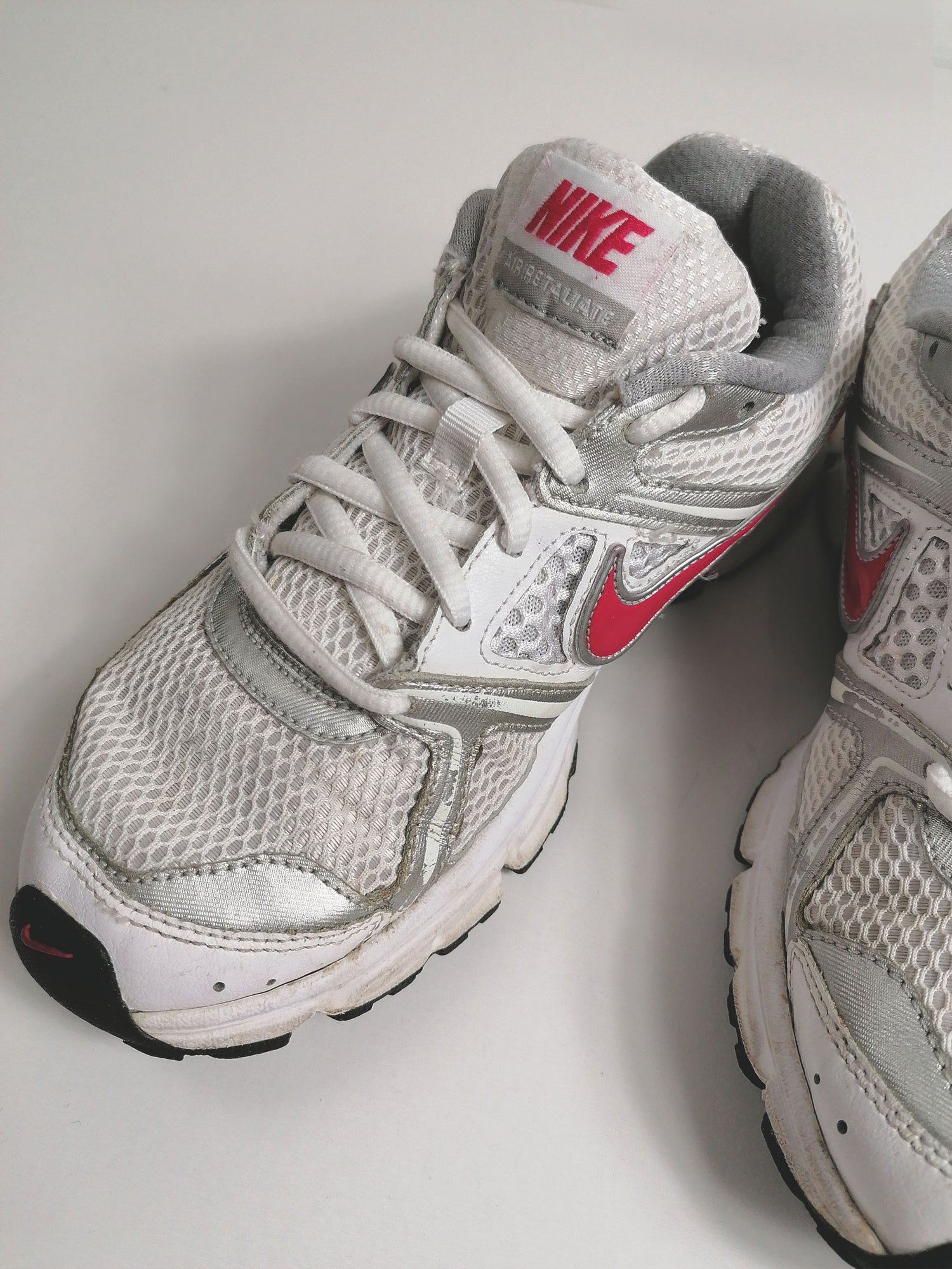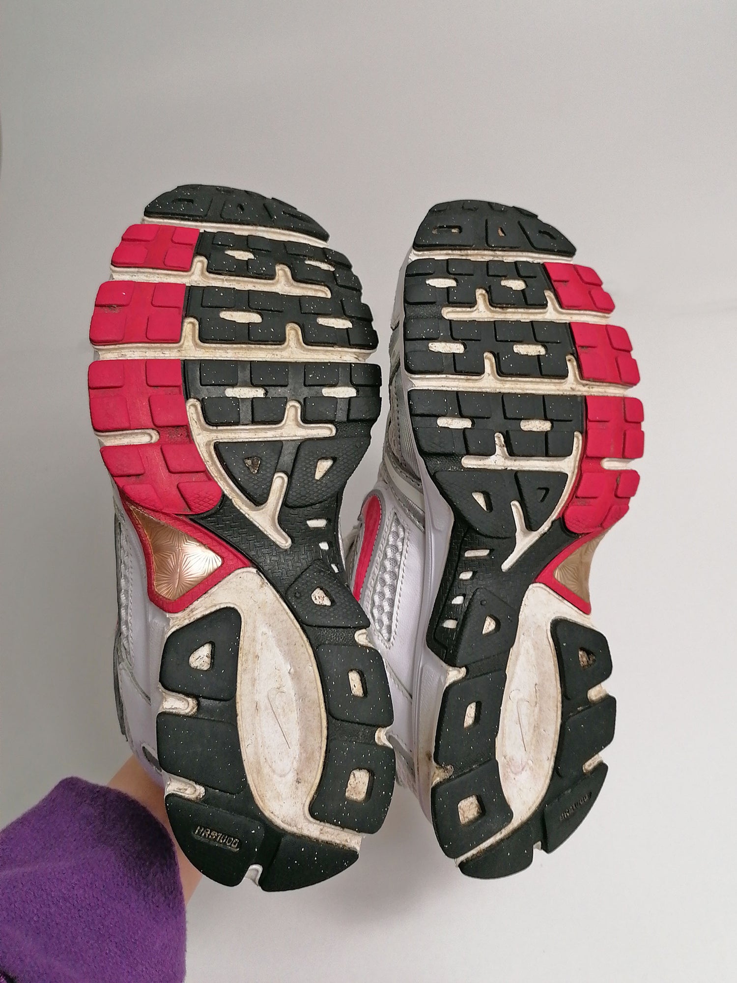 Vintage 2010 Nike Air Retaliate running/tennis sneakers, silver mesh with pink swoosh.