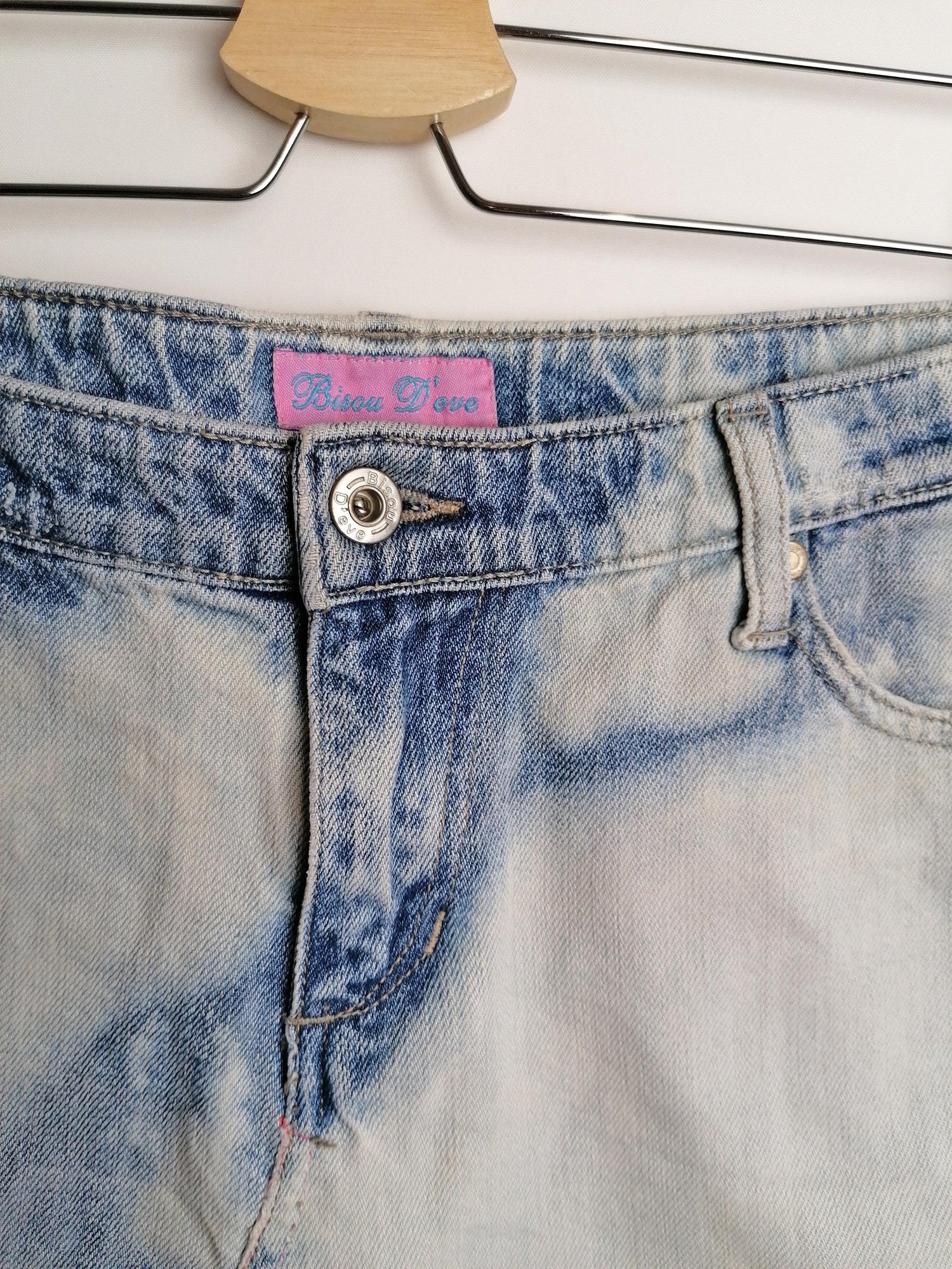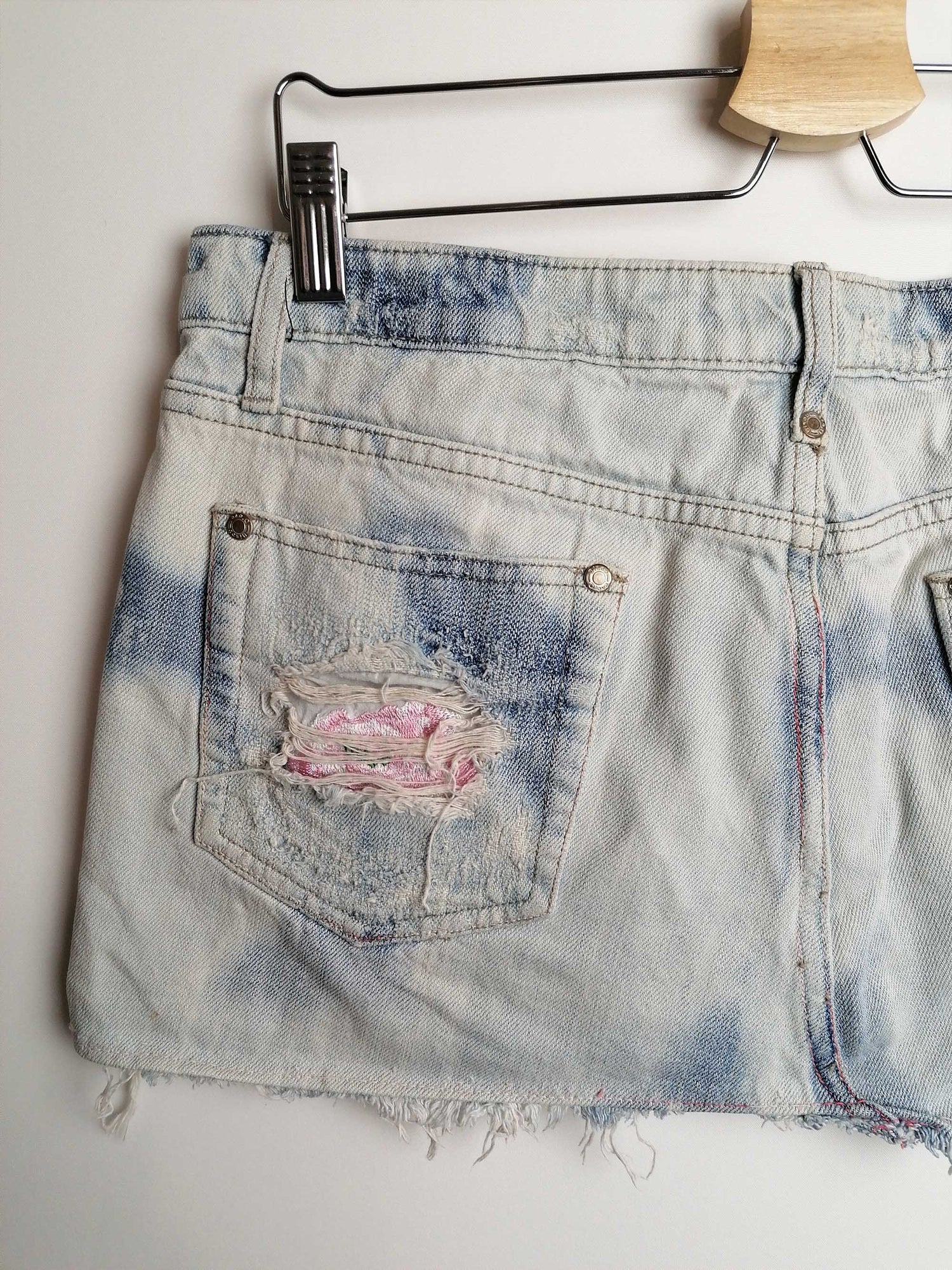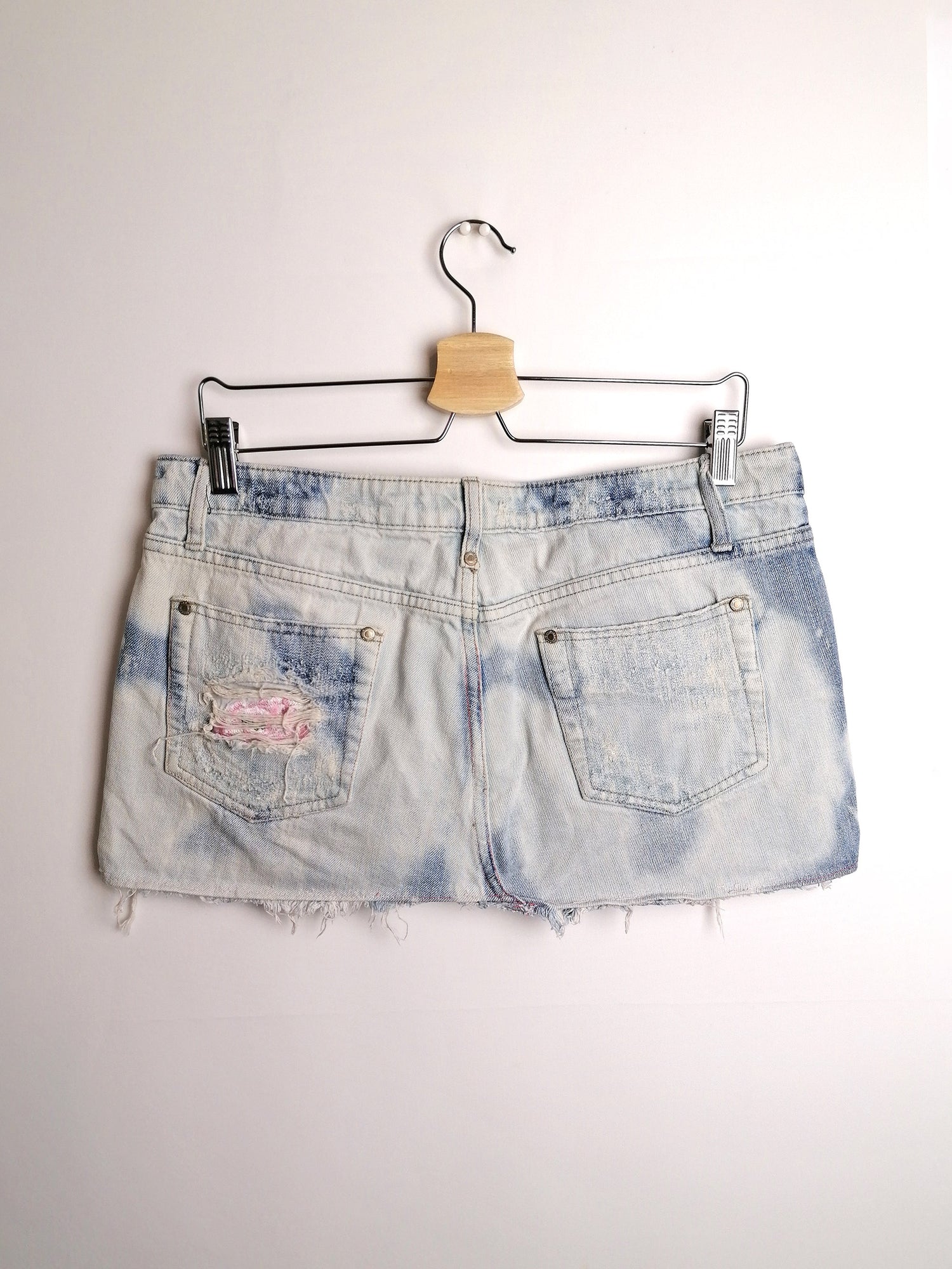 Y2K denim skirt, super low-rise waist, distressed look.