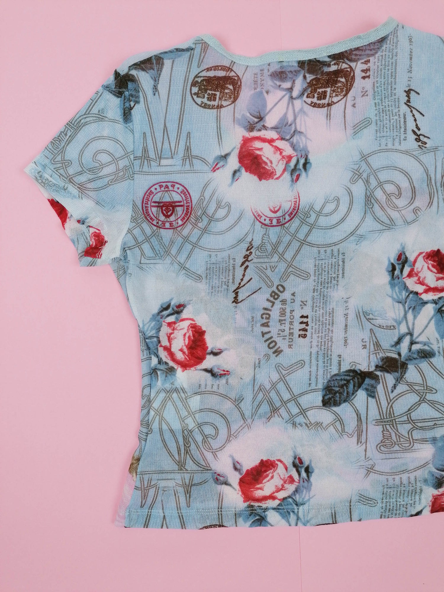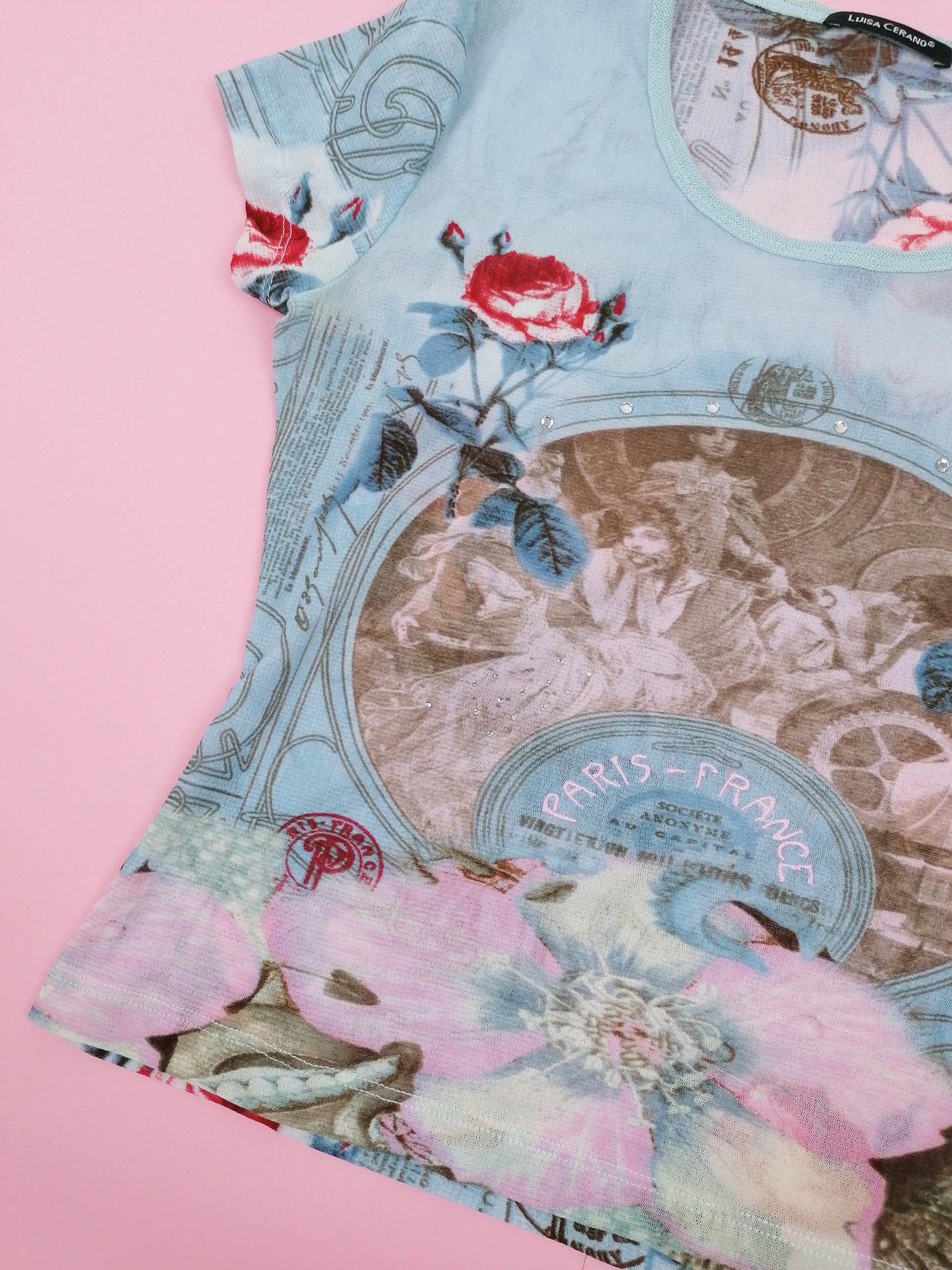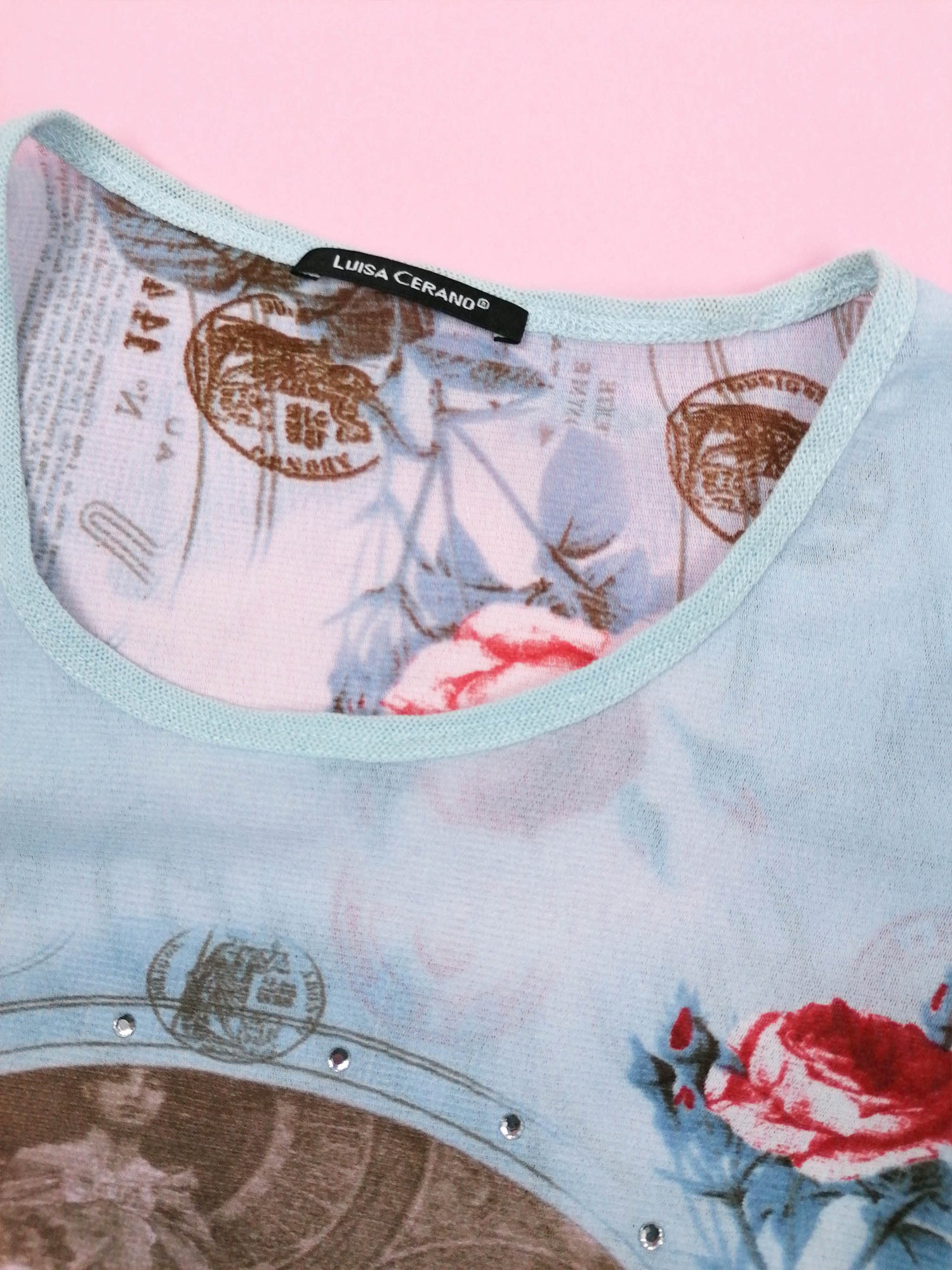Y2K luisa Cerano sheer mesh stretch top, gorgeous print, embroidery and rhinestones detail.