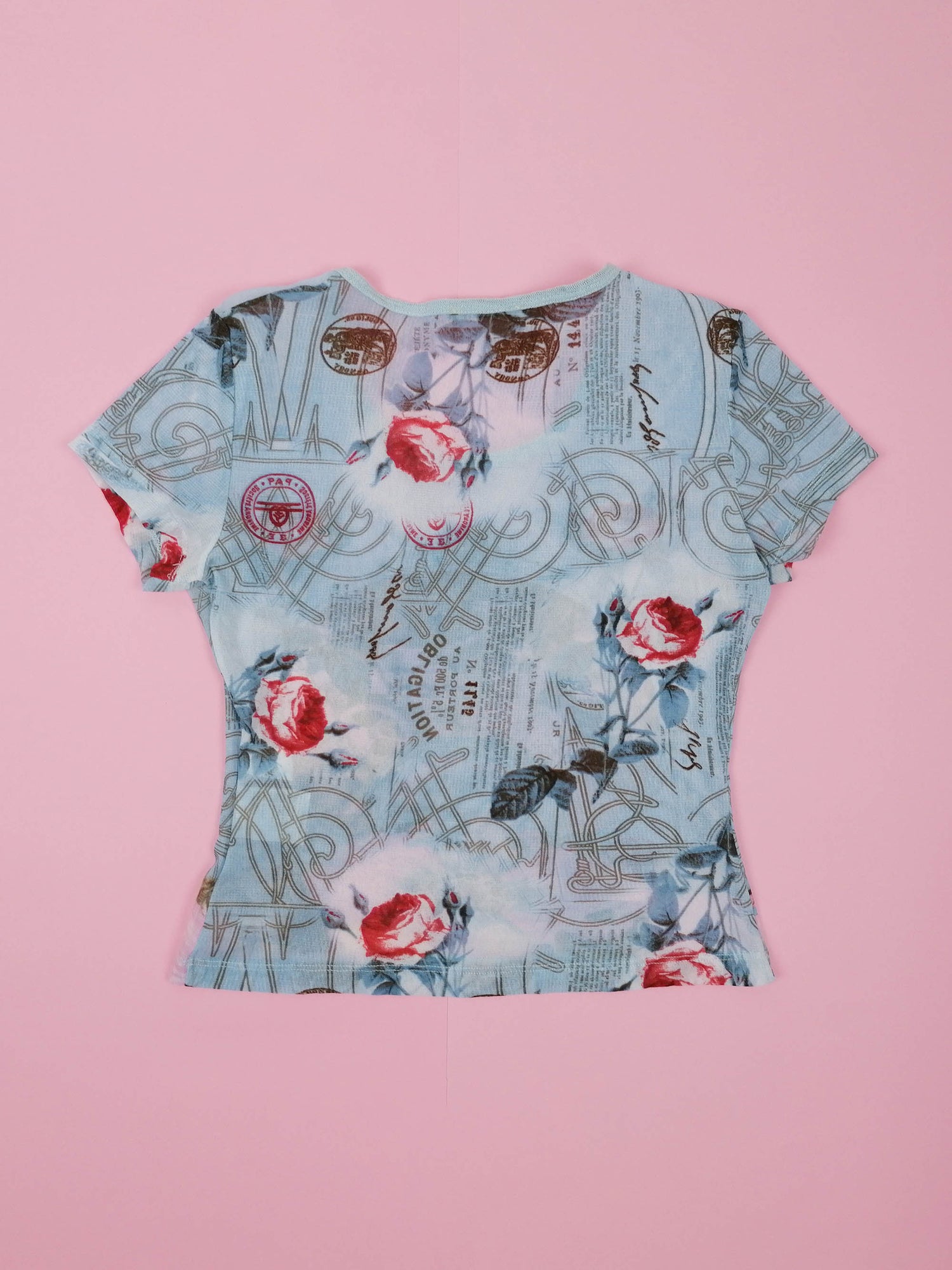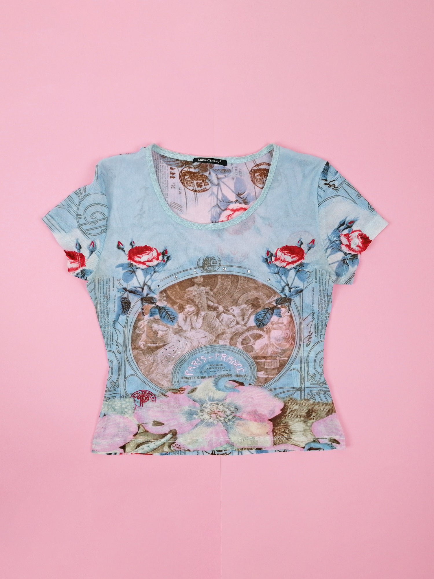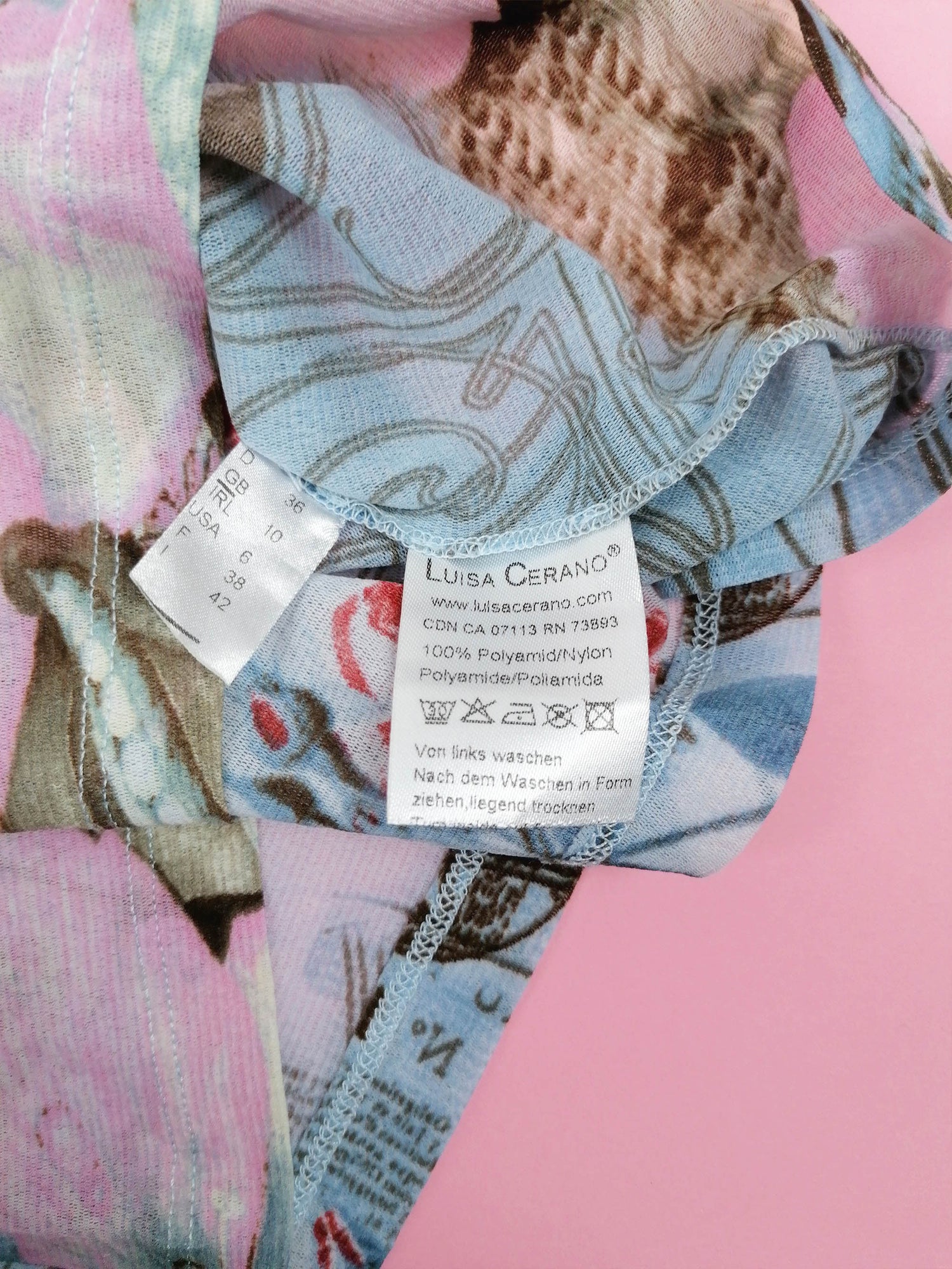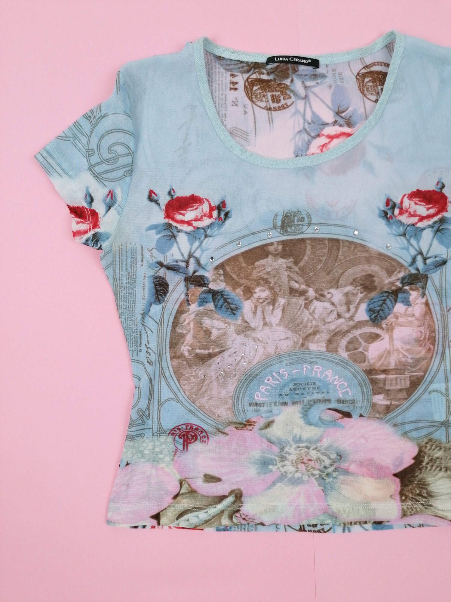 Y2K luisa Cerano sheer mesh stretch top, gorgeous print, embroidery and rhinestones detail.