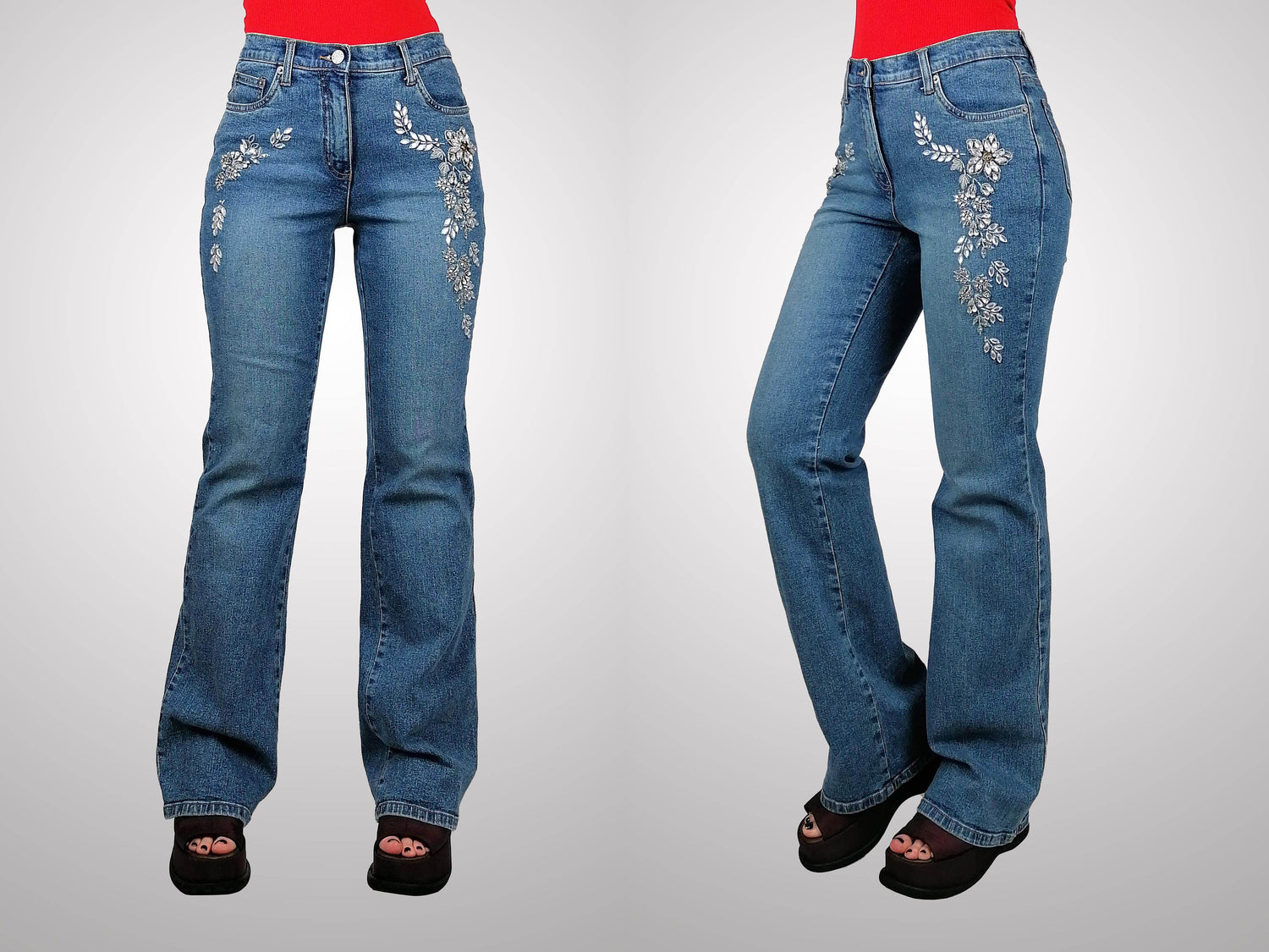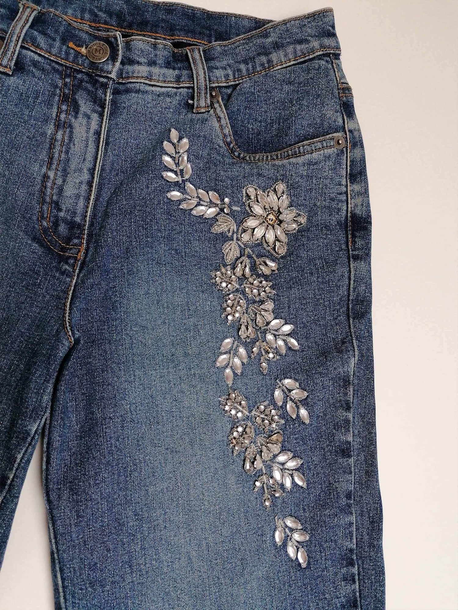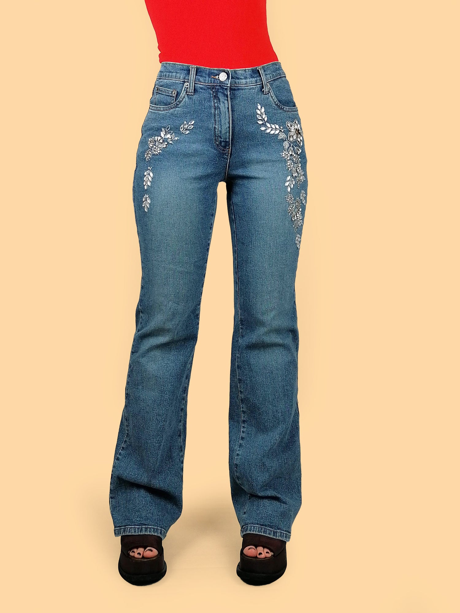 Gorgeous vintage Y2K MADELEINE designer jeans, slightly flared leg, sparkly gems embellishments on front.