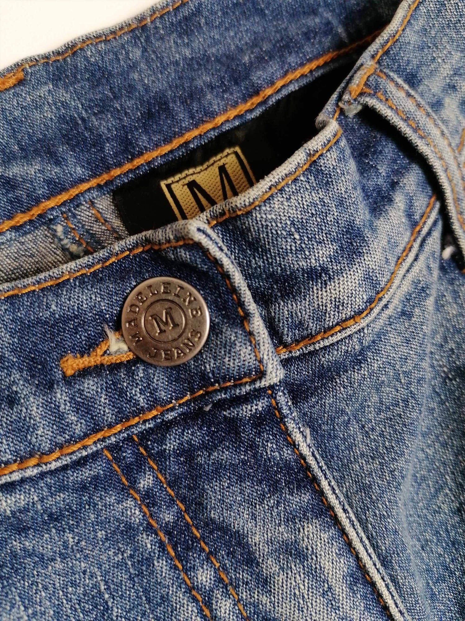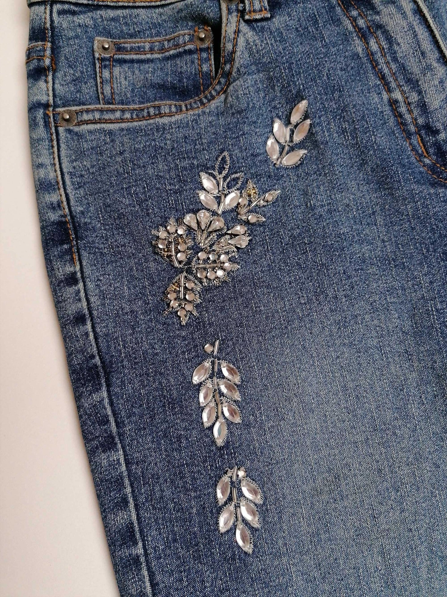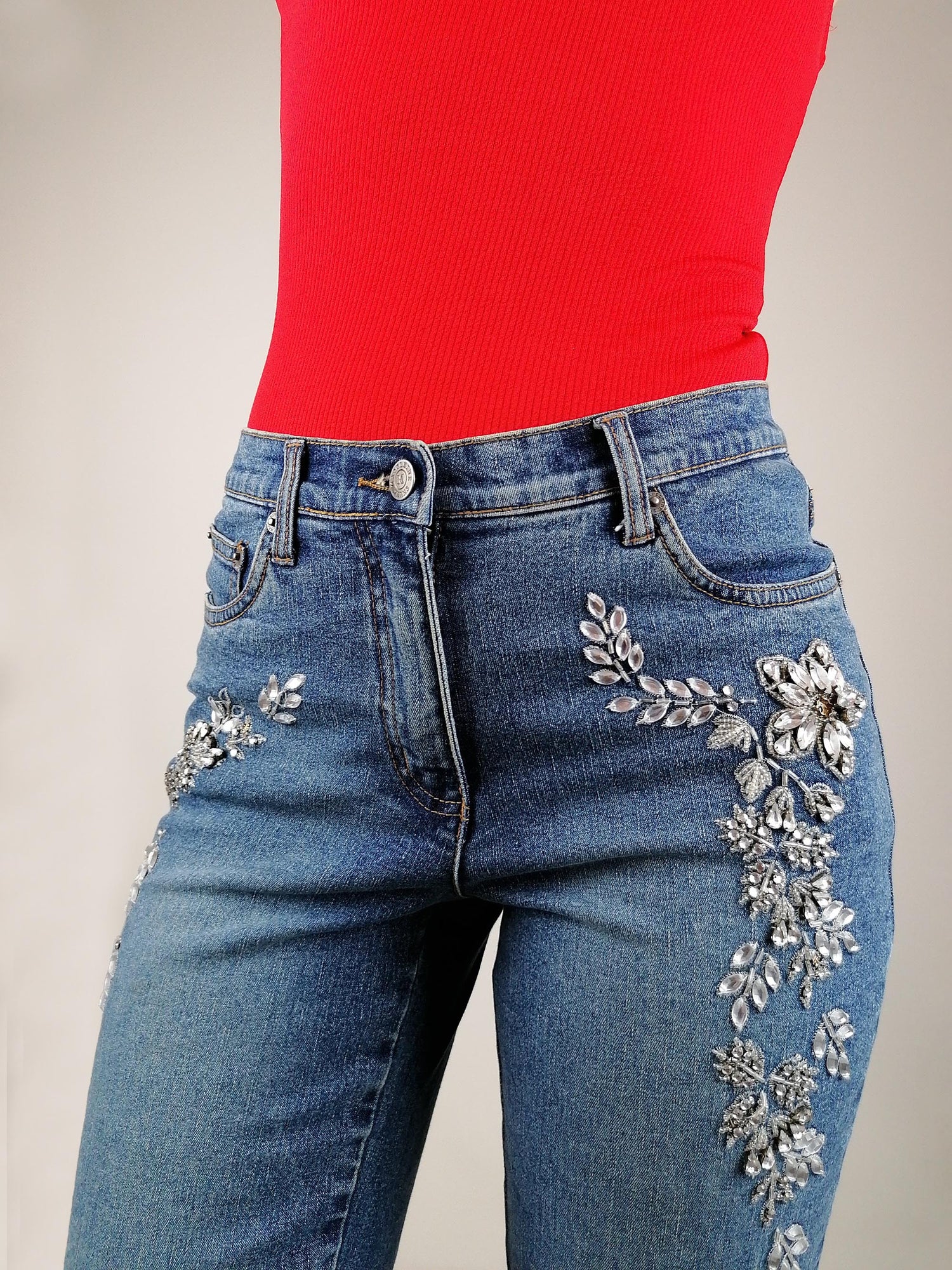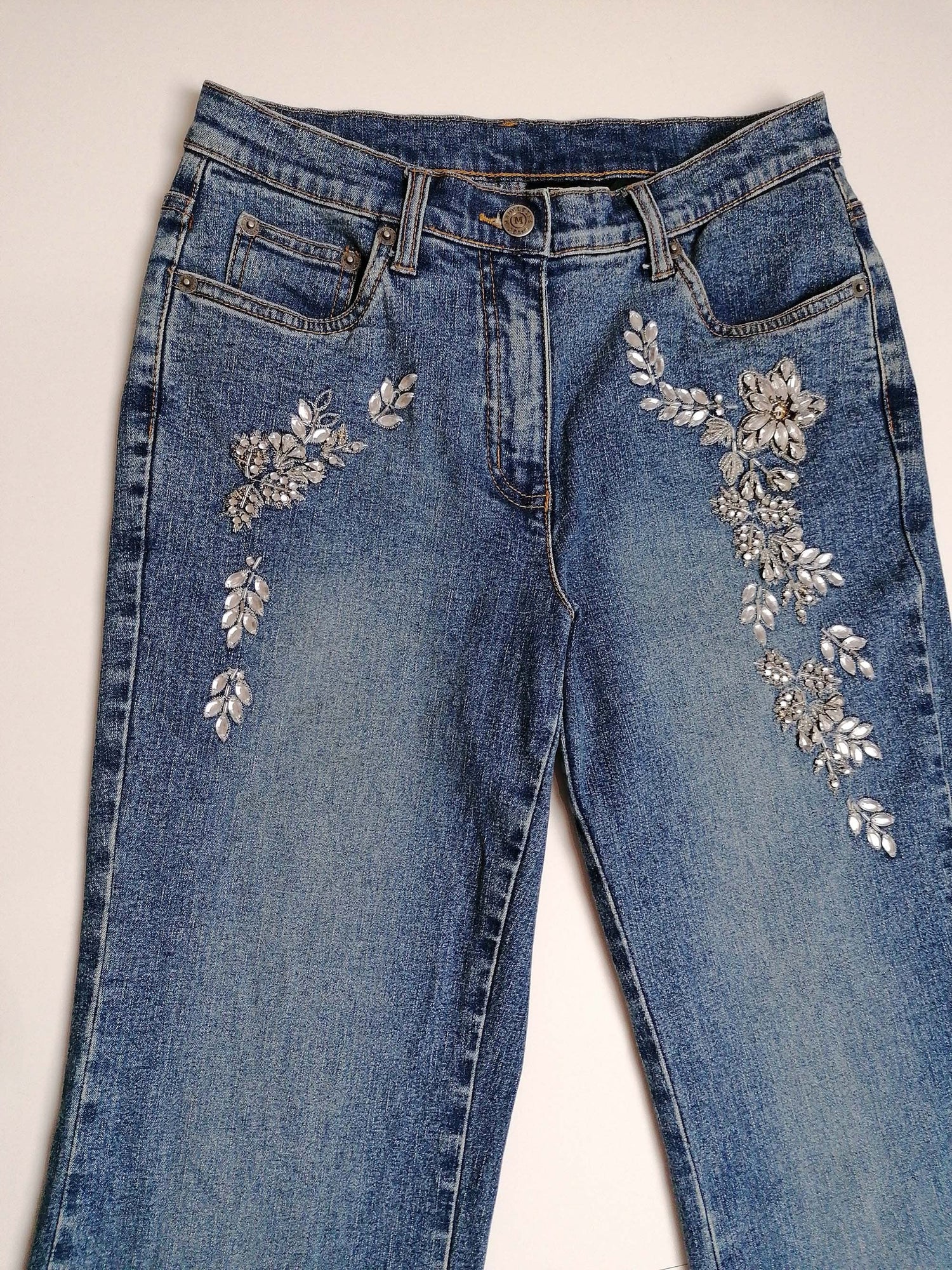 Gorgeous vintage Y2K MADELEINE designer jeans, slightly flared leg, sparkly gems embellishments on front.