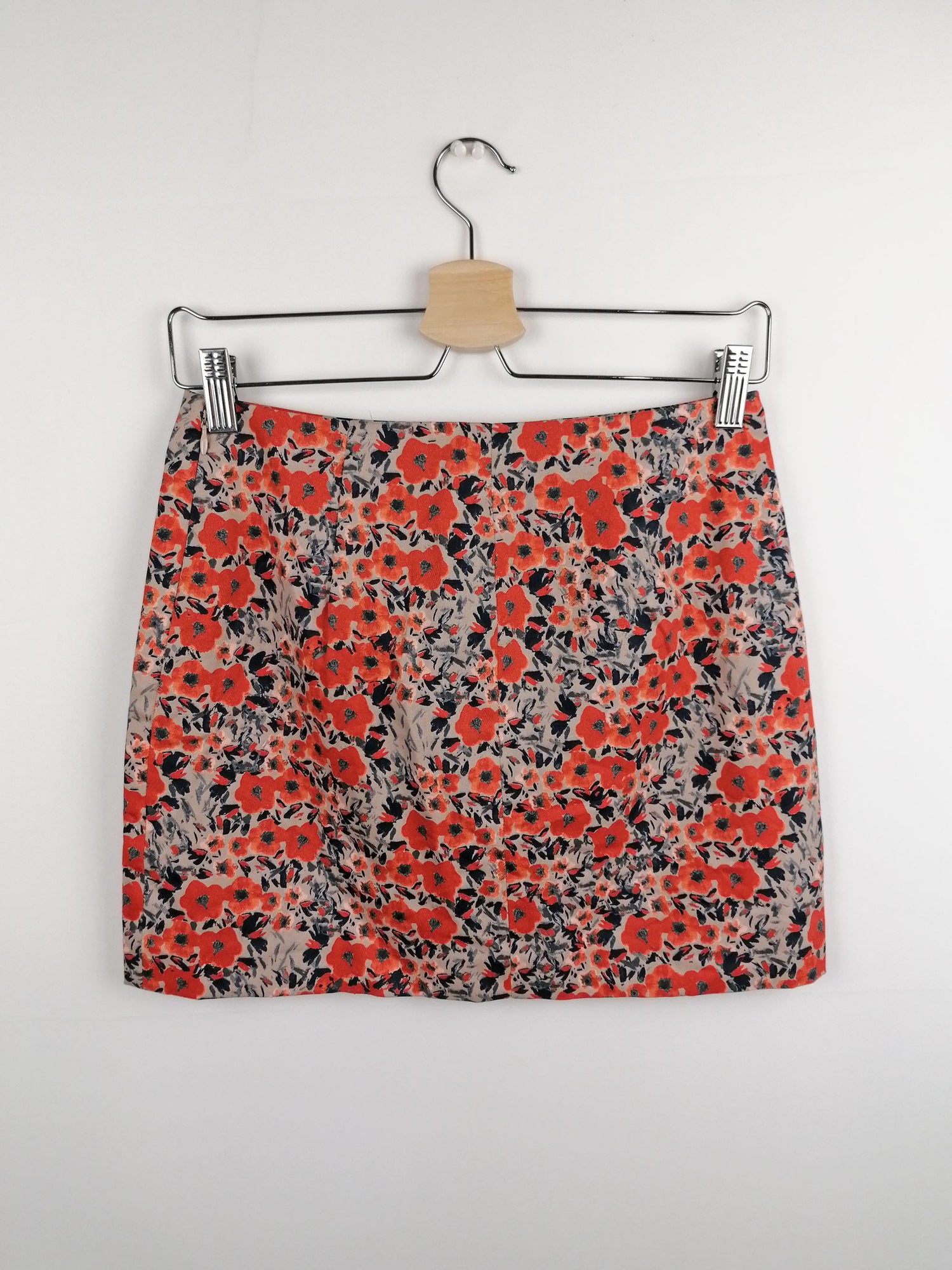 Cute Y2K mini skirt, floral pattern in orange and shades of grey.