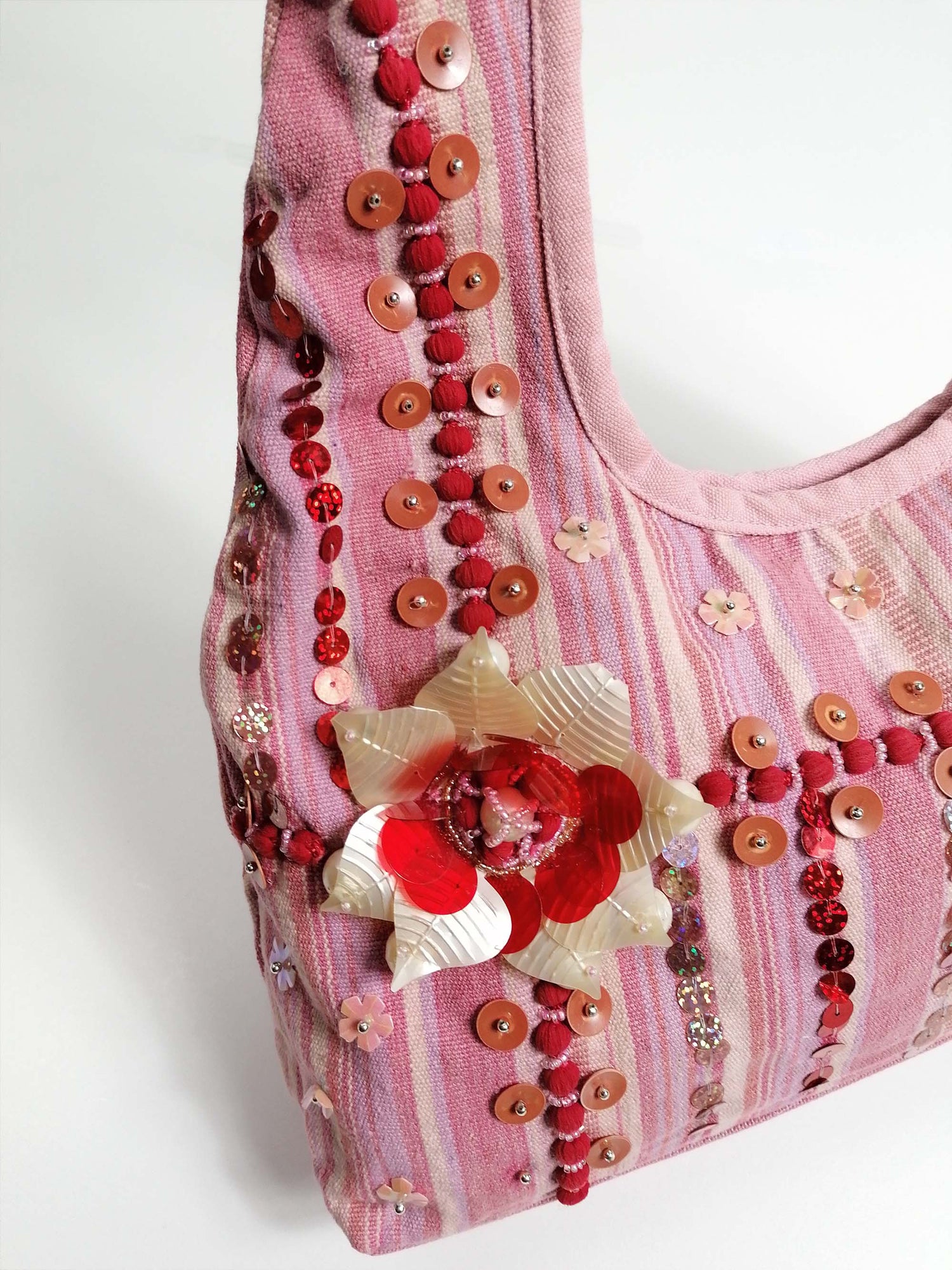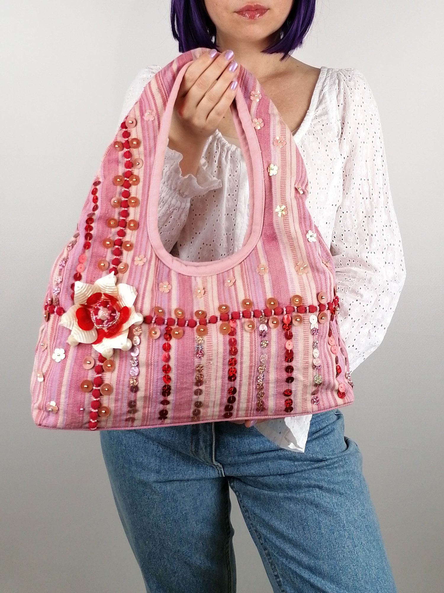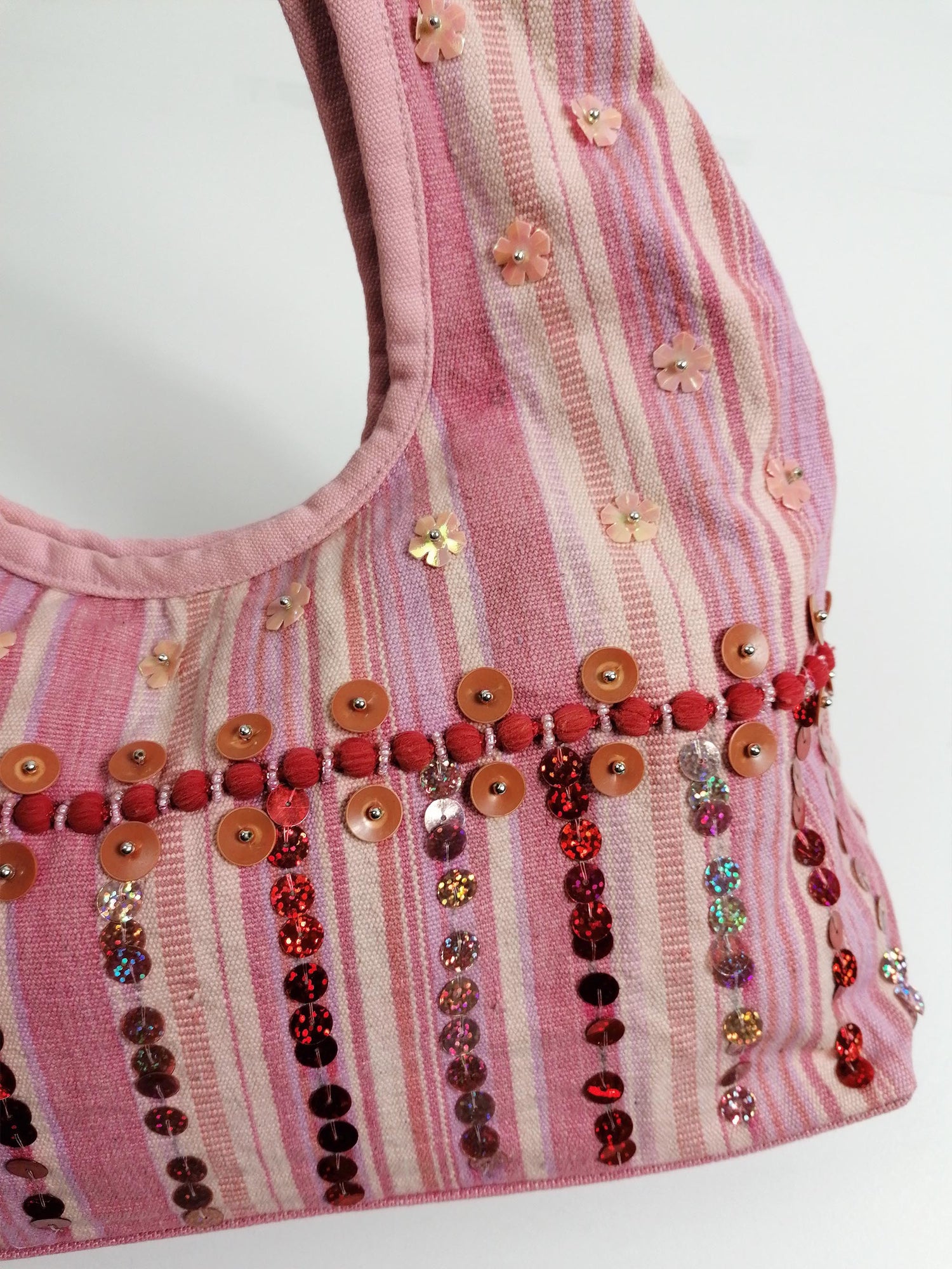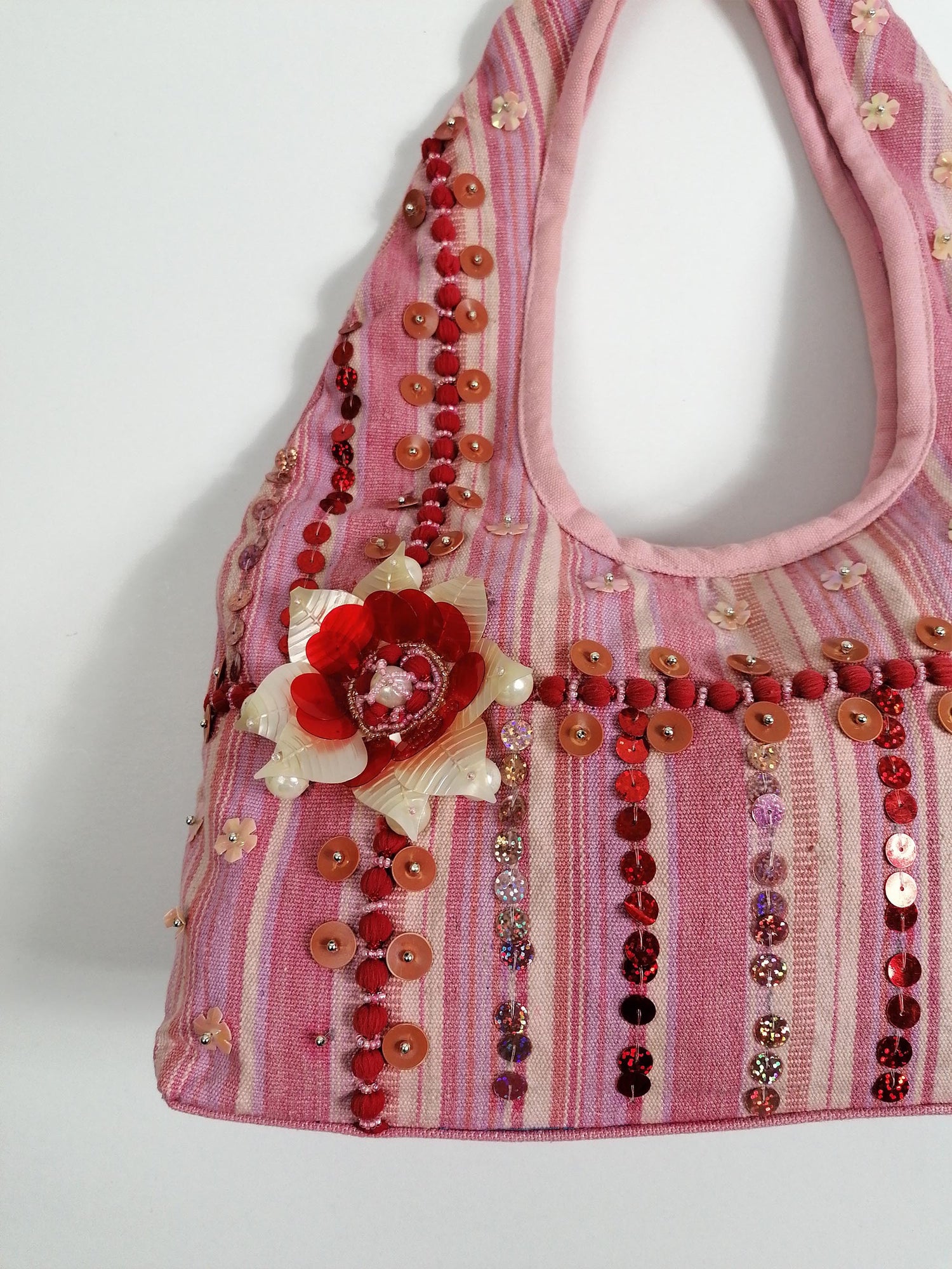 Gorgeous Y2K canvas bag, pink with sequins stripes and sparkly flower, made in India.