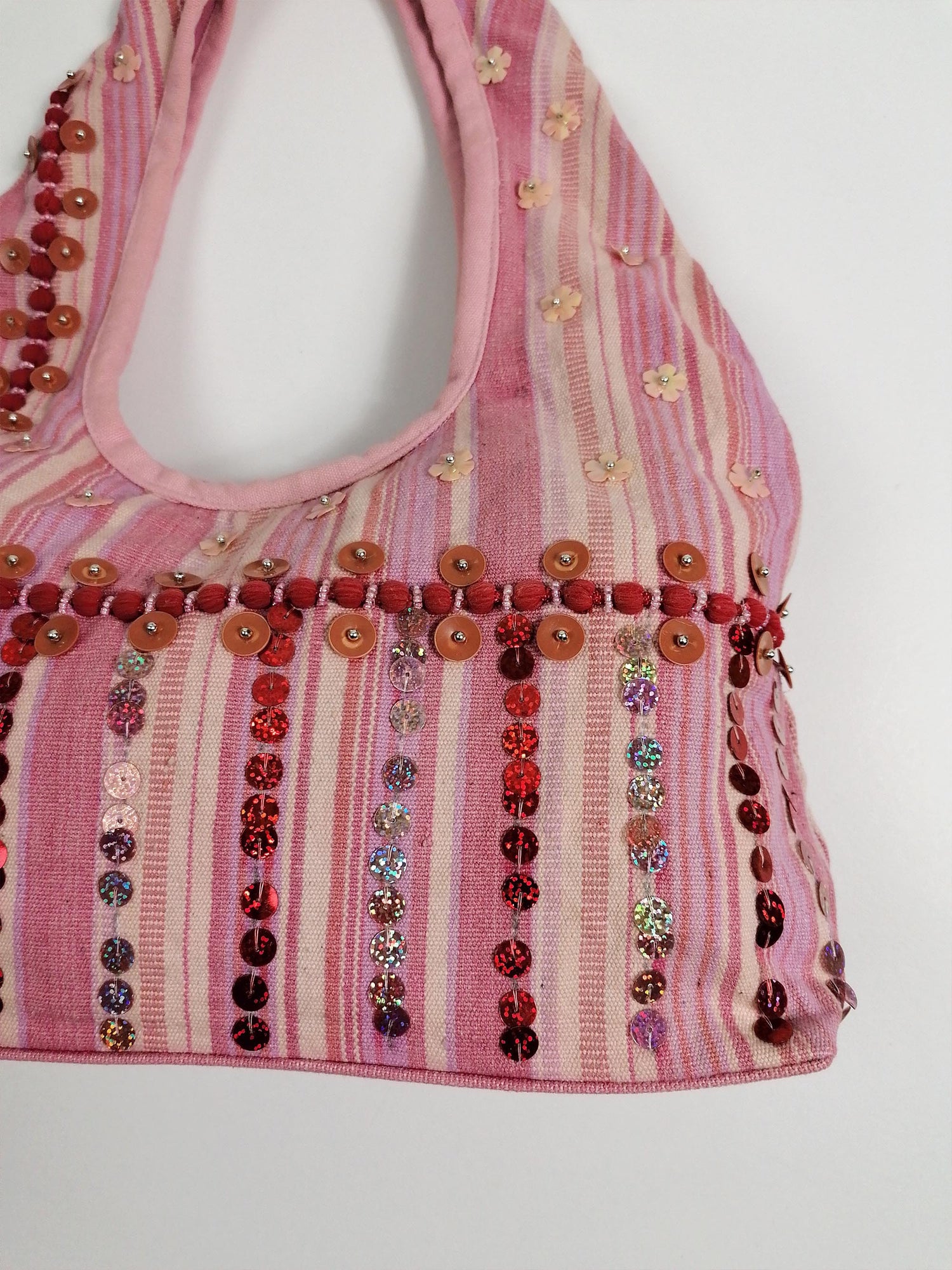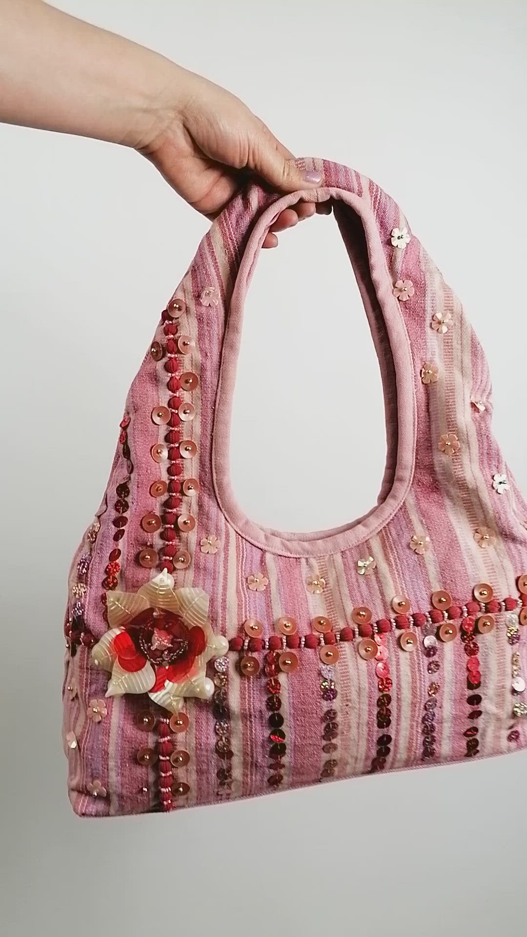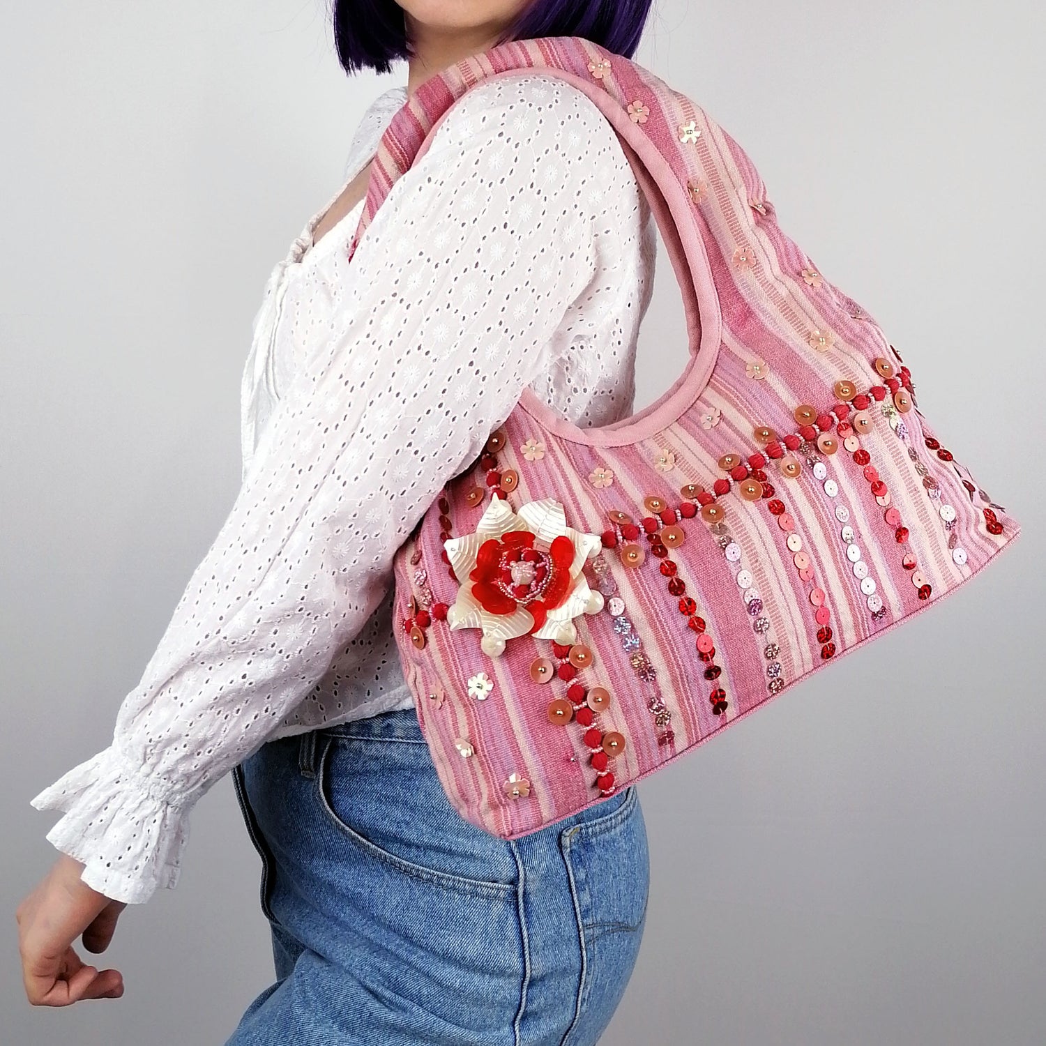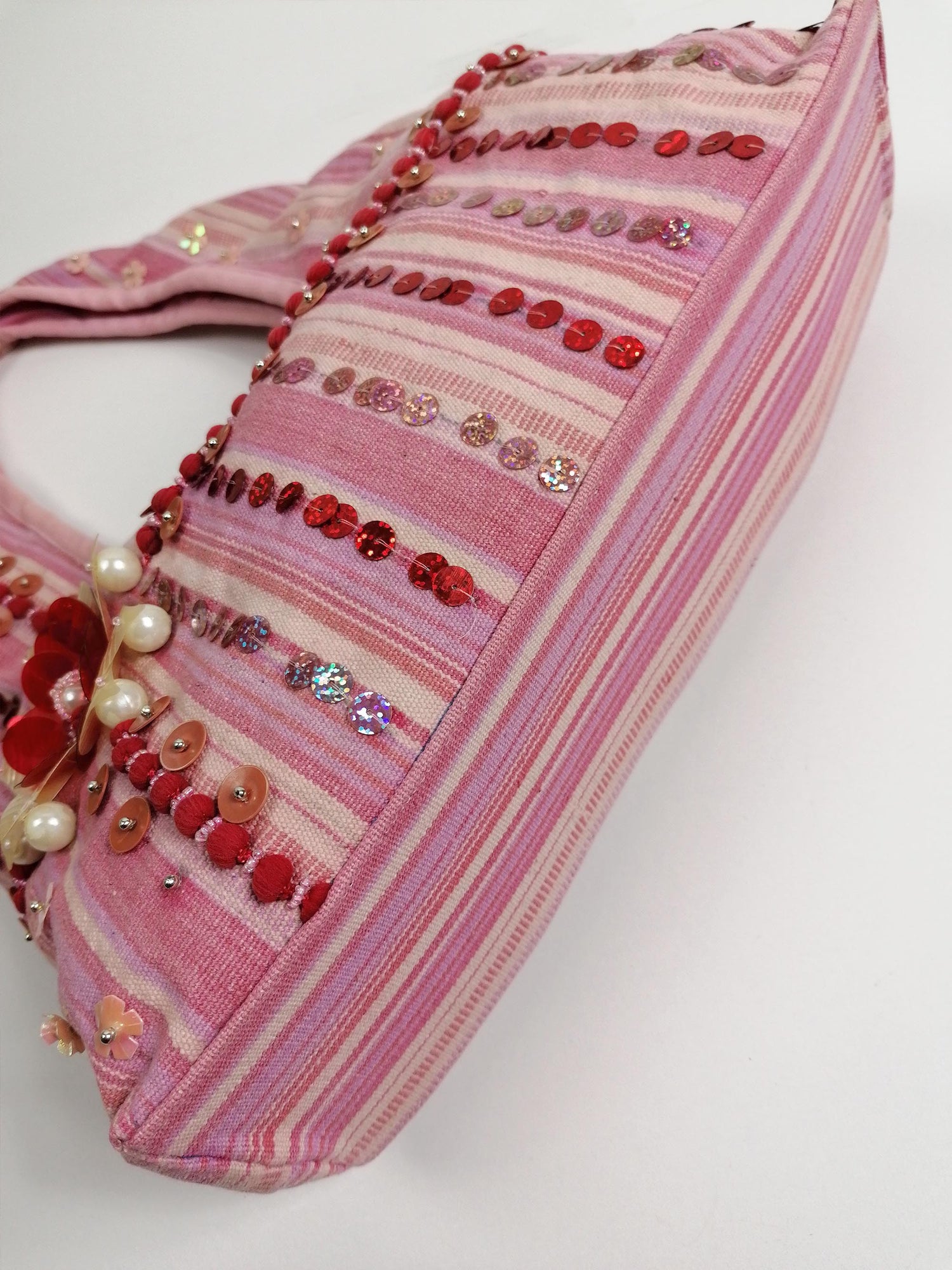 Gorgeous Y2K canvas bag, pink with sequins stripes and sparkly flower, made in India.