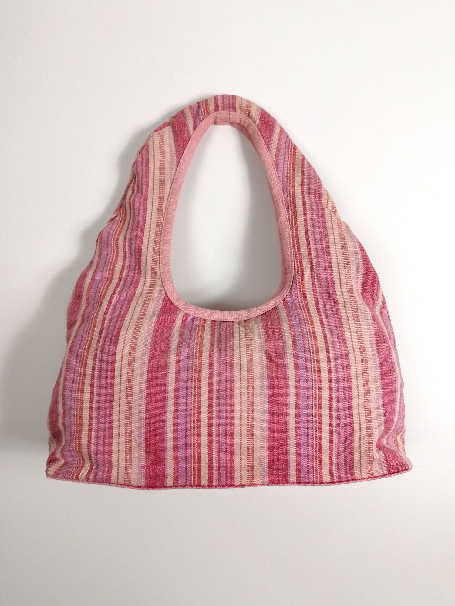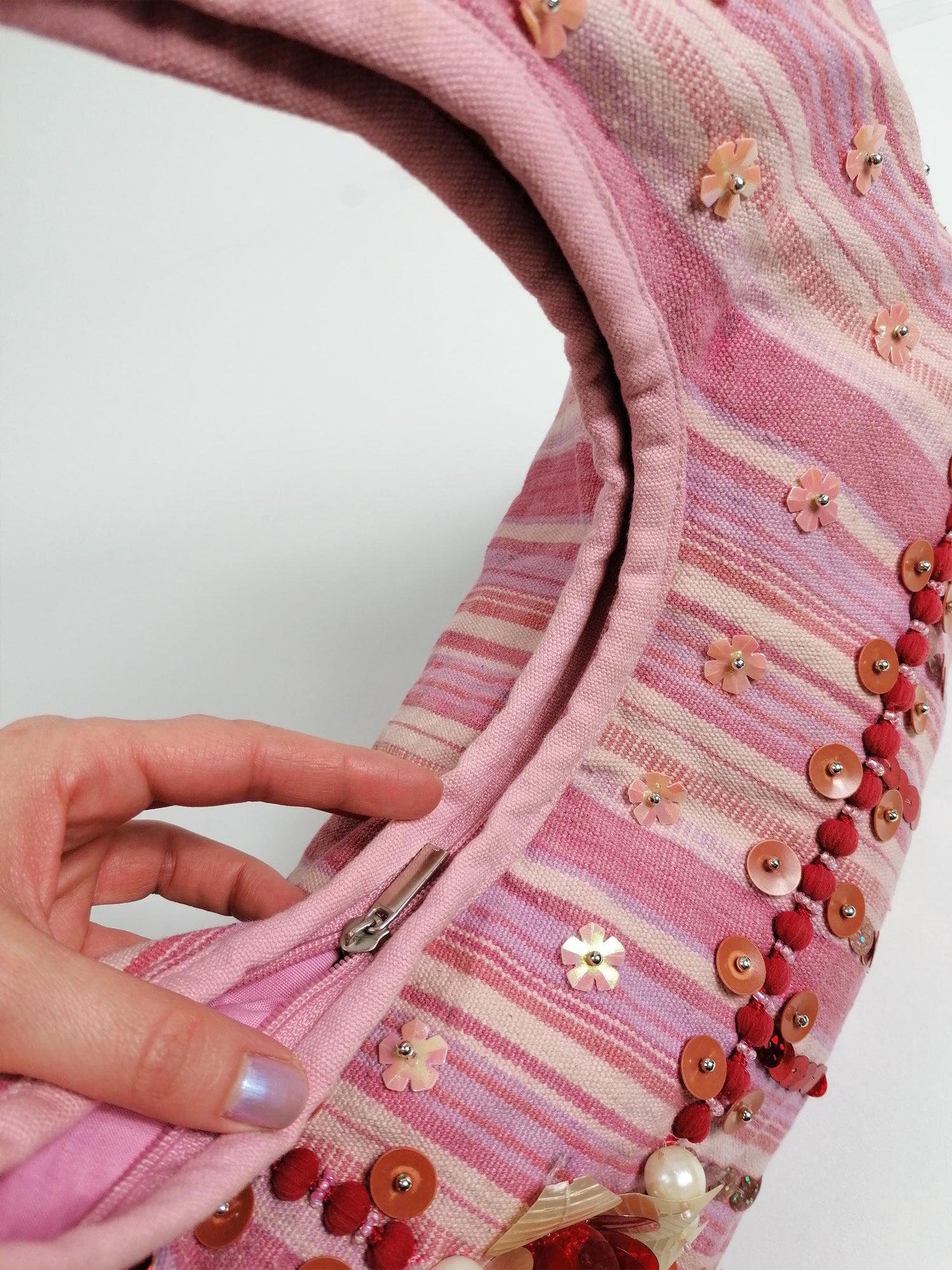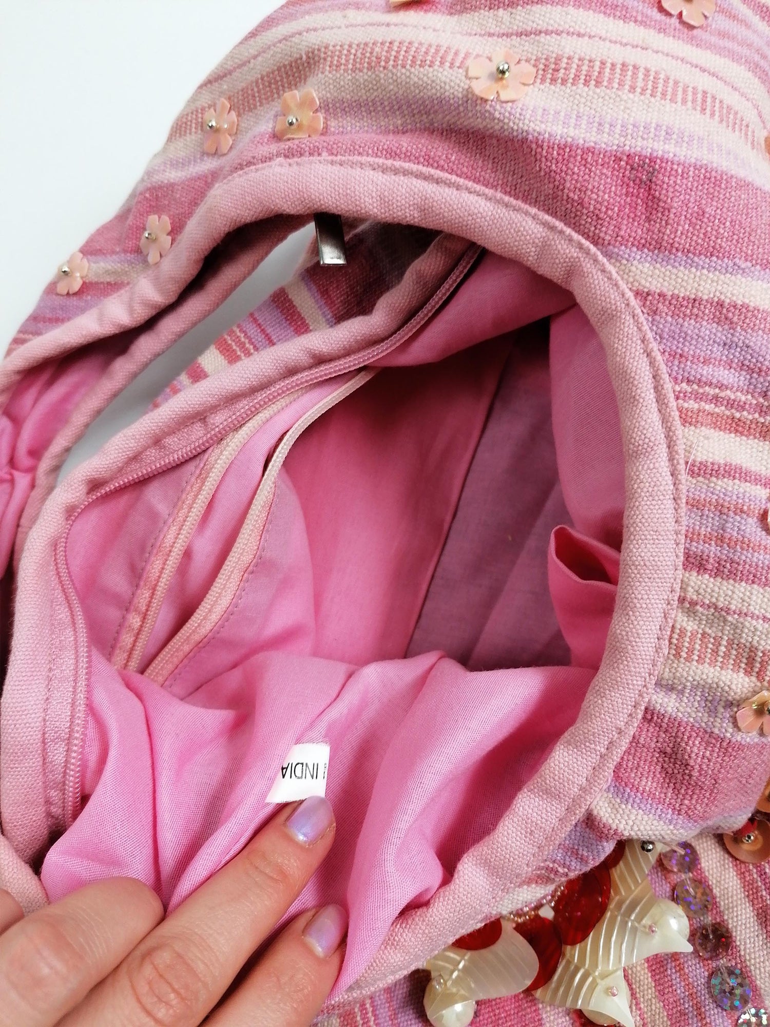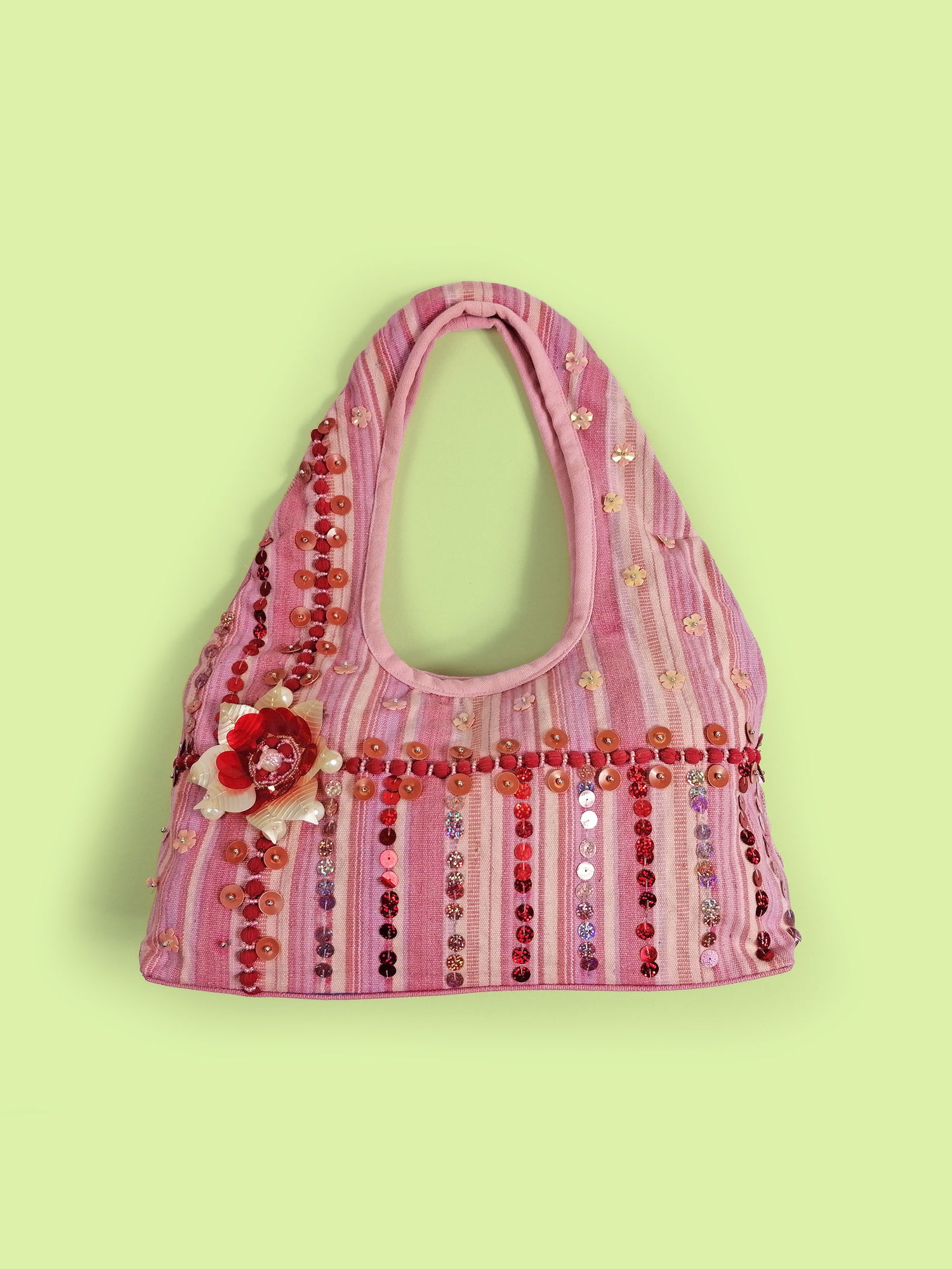 Gorgeous Y2K canvas bag, pink with sequins stripes and sparkly flower, made in India.