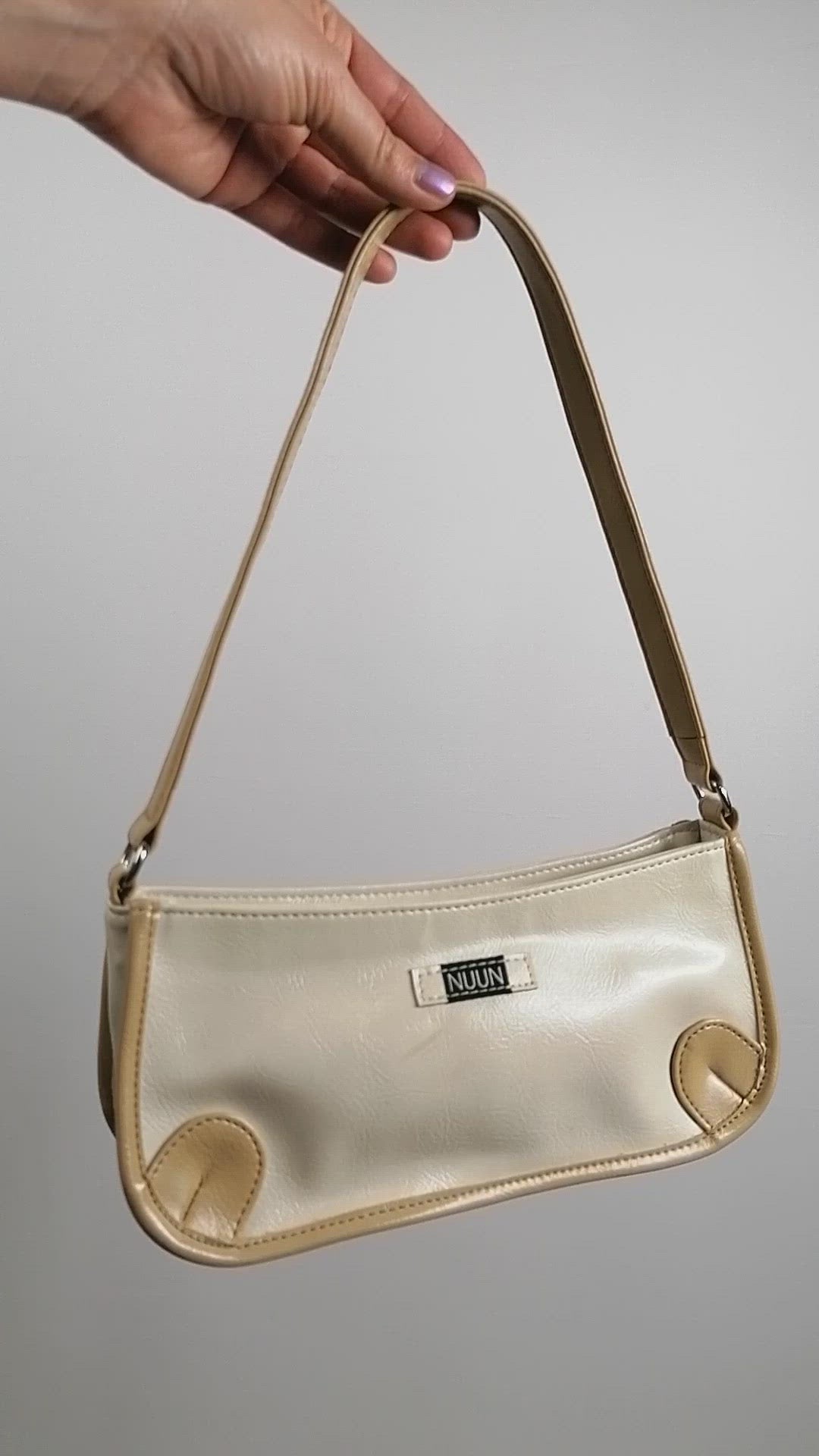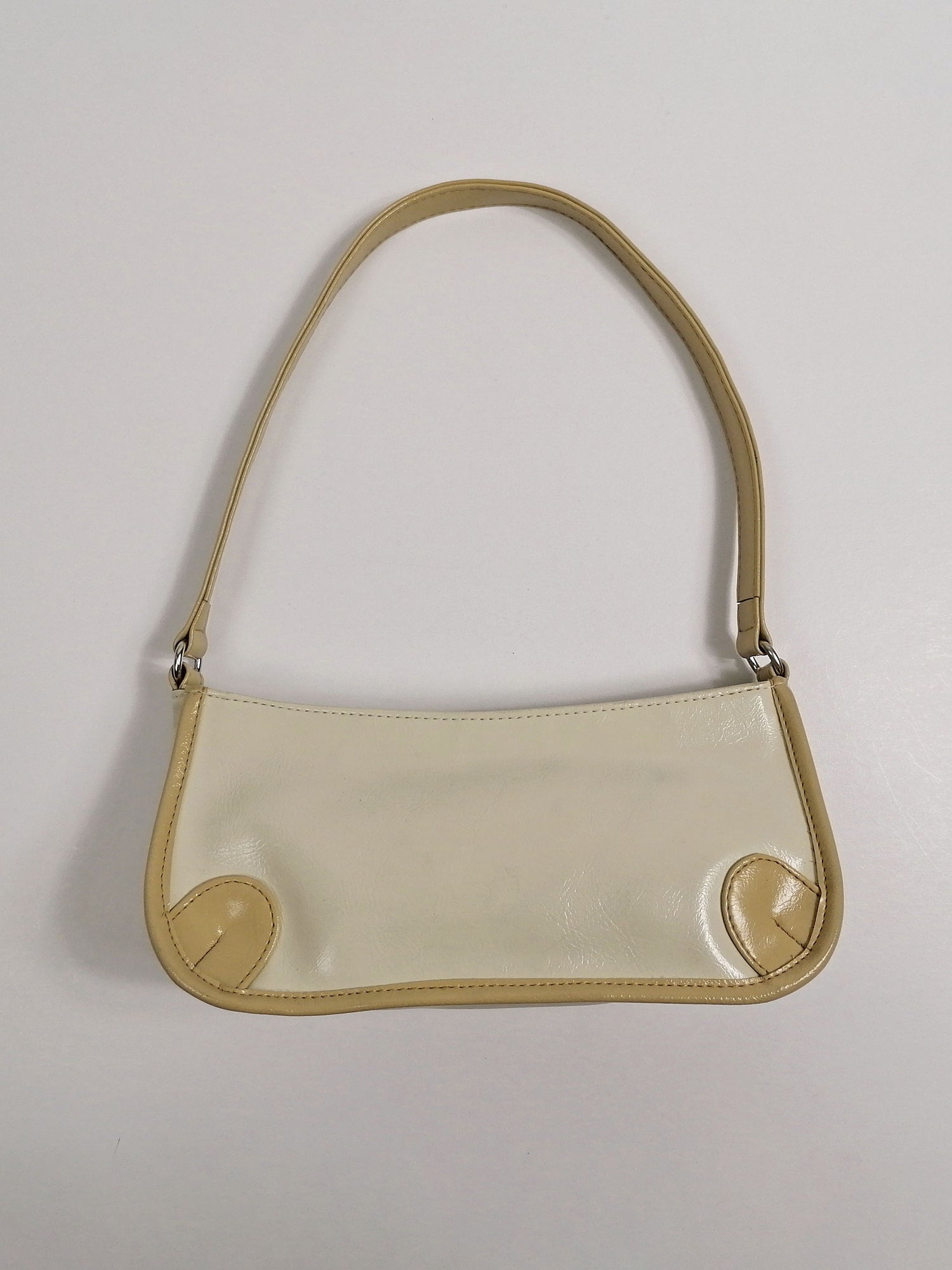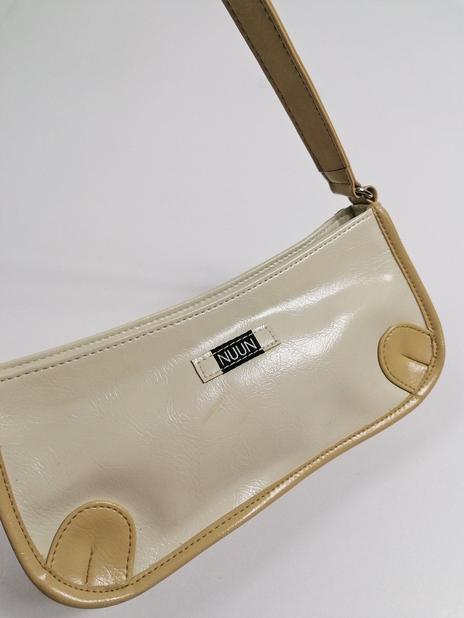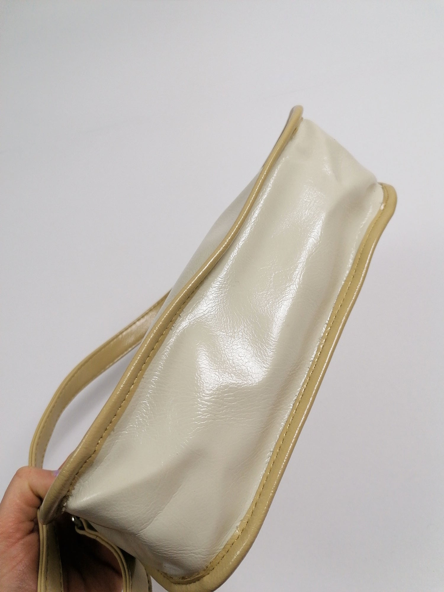 Cute Y2K small bag, shiny cream with brown trim and handle, zipper closure.