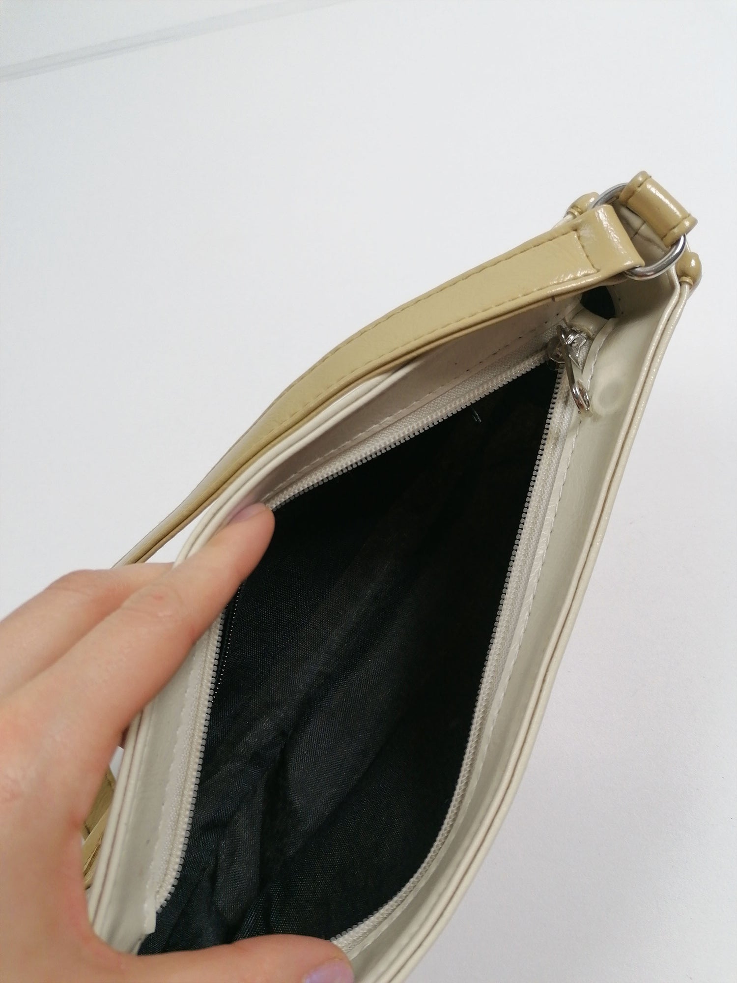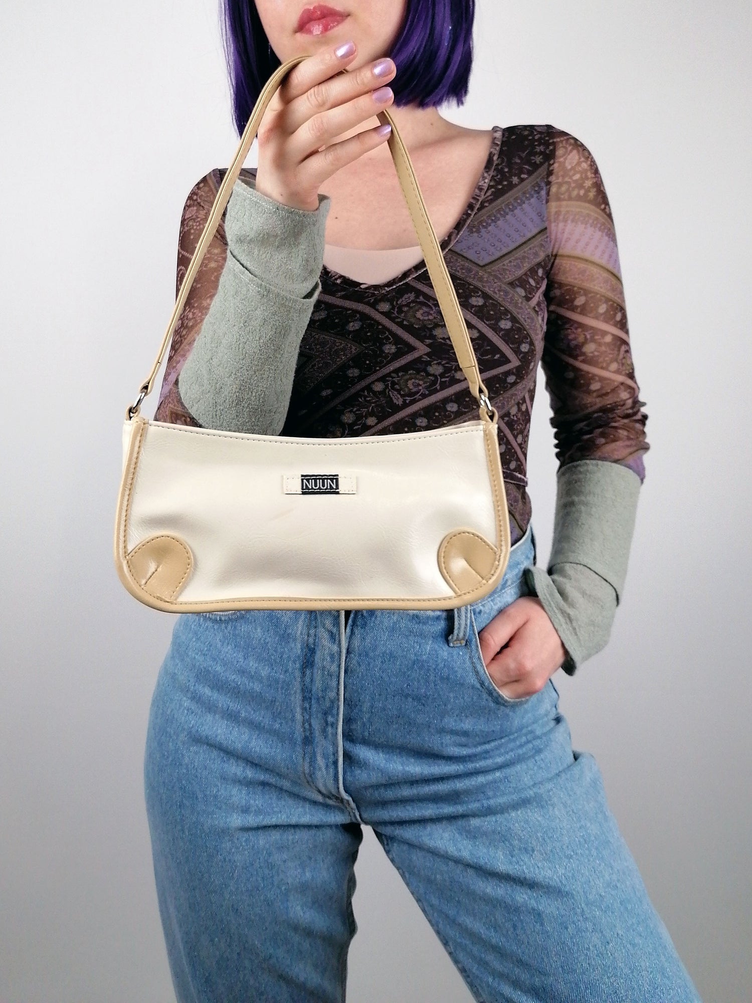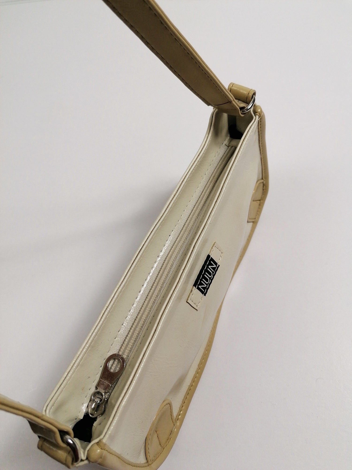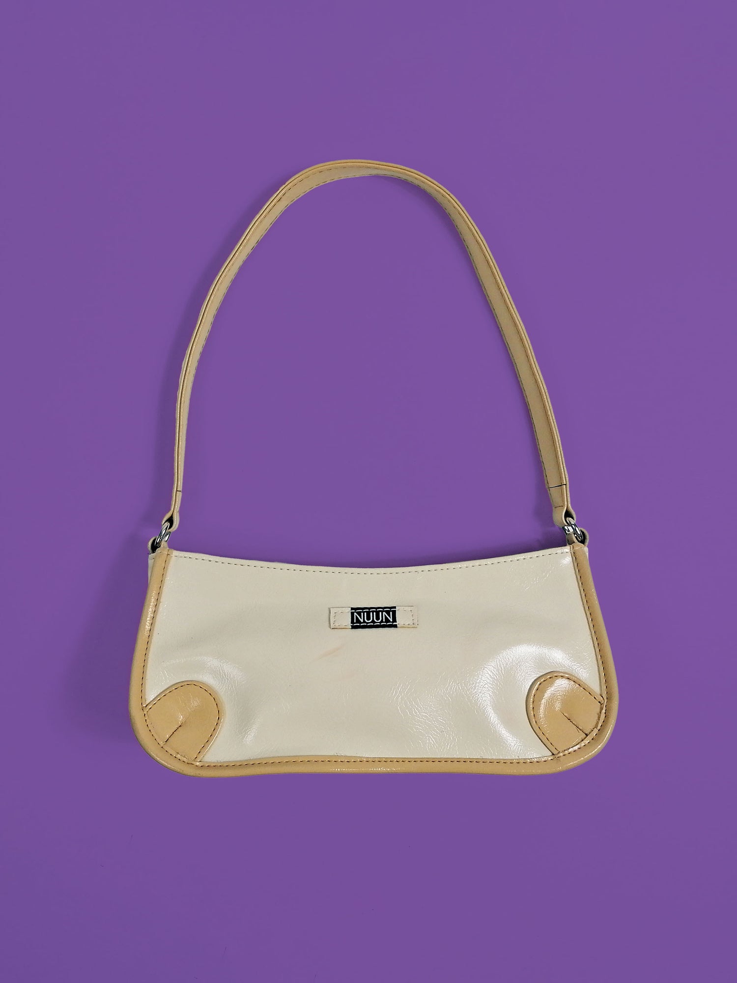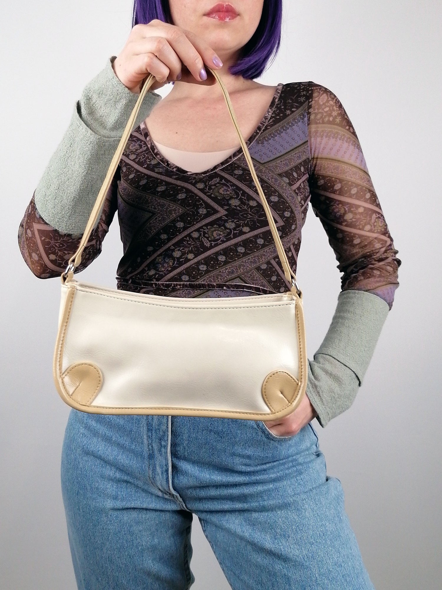 Cute Y2K small bag, shiny cream with brown trim and handle, zipper closure.